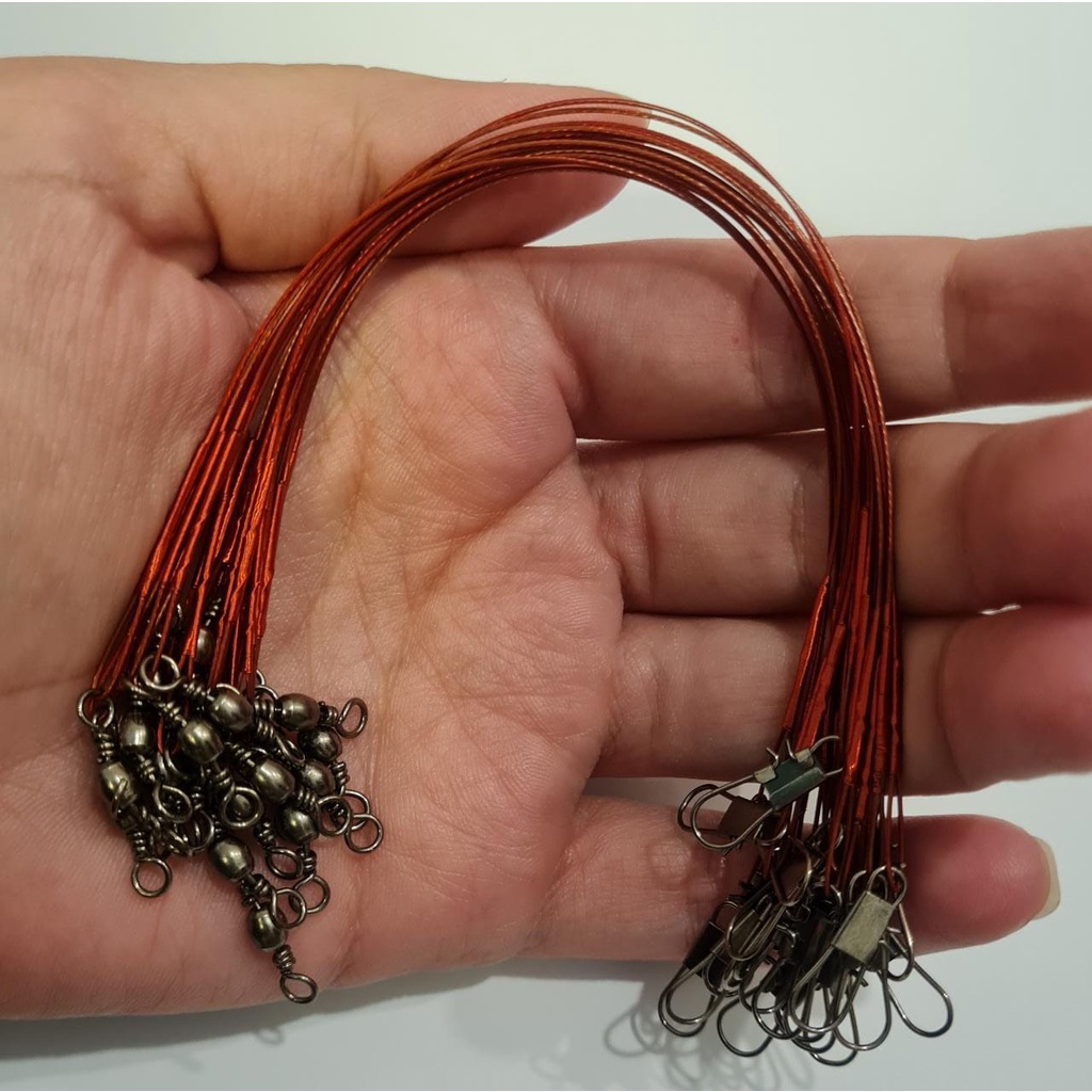 Kit C/ 20 Snap Cabo Aço C/ Girador Encastroado Leader Castor Comprimento: 18,5cm Peso: 0,2g (aproximado) Material: Fio de aço Cor: 2 cores disponíveis (prata e verde) Suporta de: 8 a 12 Kg Detalhe: Incluso barrel giratório na parte inferior e encaixe giratório no topo. Conteúdo: 20 un.