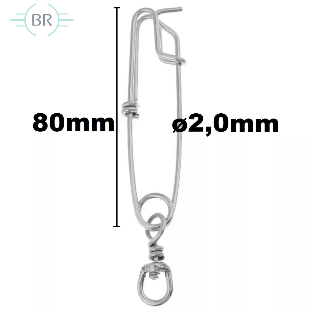 SNAP UNITARIO EM INOX COM DISTORCEDOR PARA ESPINHEL Fabricado com aço inoxidável de alta qualidade, alta resistência e bom desempenho contra corrosão de água do mar. O snap tem um girador em inox na sua base, que é capaz de girar em 360°, o que previne com que as linhas de pesca se enrolem. O clip foi confeccionado em aço inoxidável, resistente à corrosão e de alta tensão. É um equipamento prático para ser utilizado em várias pescarias de espinhel e longline. ESPECIFICAÇÕES: * Marca: Deyu * Modelo: V ou U * Material: Aço inoxidável
