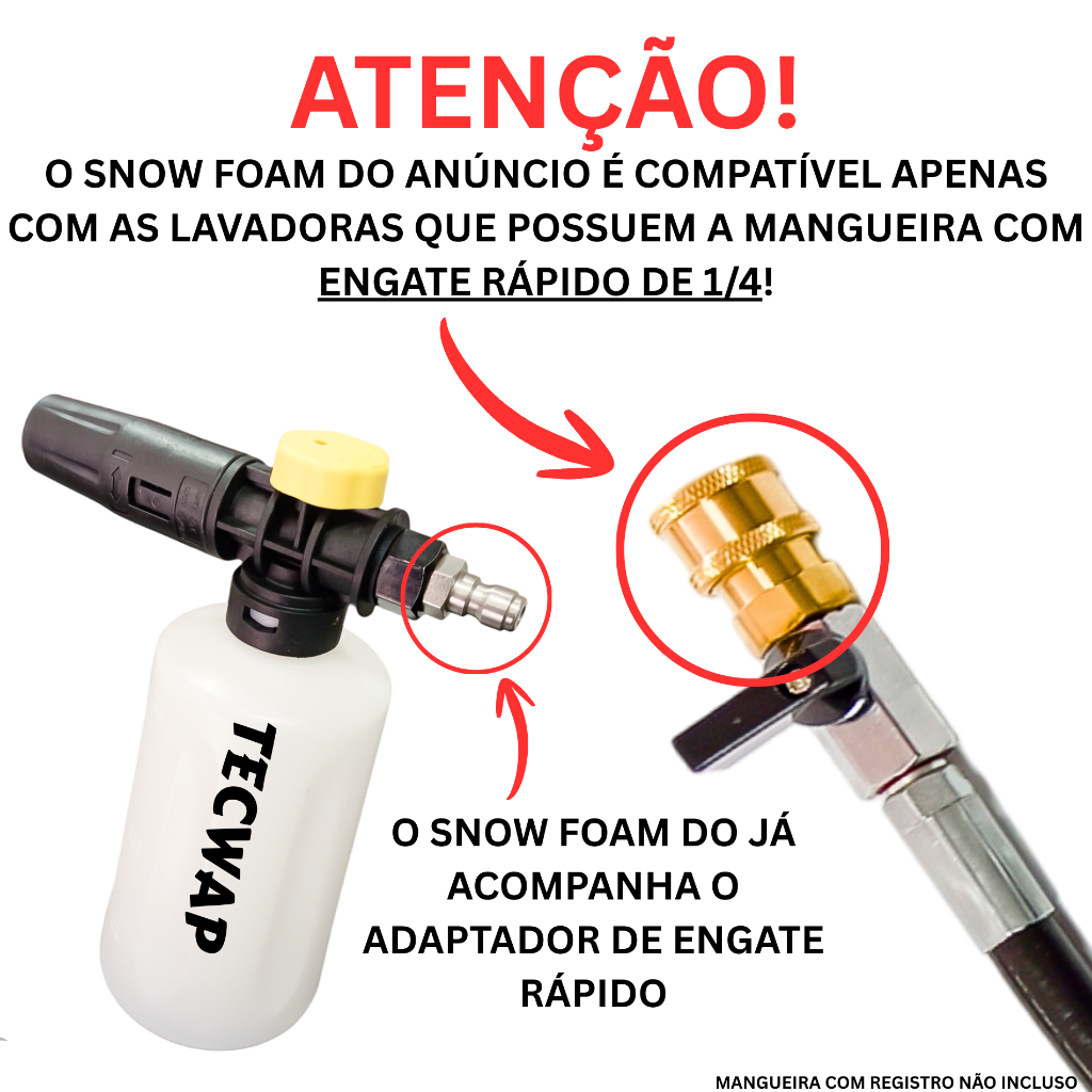 ATENÇÃO! O SNOW FOAM DO ANÚNCIO É COMPATÍVEL APENAS COM AS LAVADORAS QUE POSSUEM MANGUEIRA COM SISTEMA DE ENGATE RÁPIDO! COMPATÍVEL APENAS COM AS LAVADORAS DE ALTA PRESSÃO DE USO RESIDENCIAL! MODELOS COMPATÍVEIS NAS FOTOS DO ANÚNCIOS! ENVIO IMEDIATO GARANTIA DE 90 DIAS