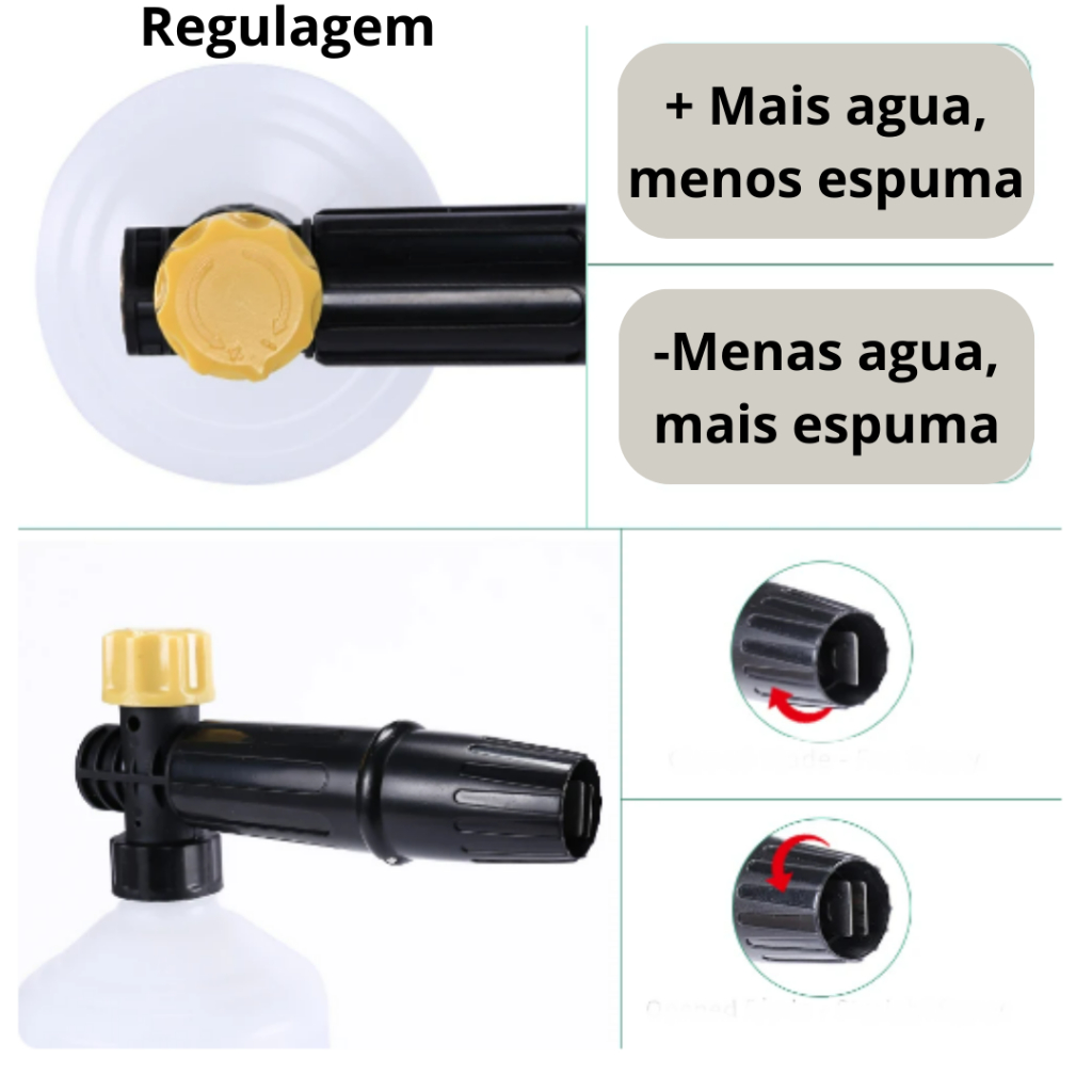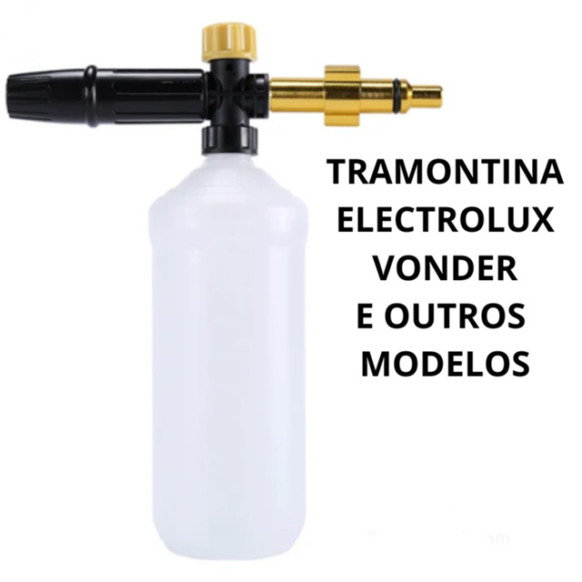 SNOW FOAM PARA LAVADORAS ELECTROLUX WAP TRAMONTINA VONDER ENTRE OUTRAS Compatível com várias marcas e modelos do mercado como: ELECTROLUX: Lavagem de Energia / Lavagem Fácil / Ultra Lavagem / Ultra Pro Modelos compatíveis da marca WAP: Lider 2200 / Premier / Ágil / Novo Eco Wash ***Qualquer duvidas de modelos e medidas, consulte-nos.*** Características do Produto: - Faixa de pressão: 60 bar a 220 bar (950 psi a 3200 psi); - Espuma abundante, grossa e de alta-densidade (A densidade da espuma dependerá diretamente da concentração e da qualidade do xampu utilizado na lavagem); - Botão com regulagem de densidade de espuma/água; - Corpo confeccionado em Polímero de excelente qualidade, bico regulador de latão. - Capacidade do recipiente: 1000 ML (1 Litro) - Consumo ajustável espuma e ângulo variável do fino ao leque de 60 ° - Altamente resistente aos produtos químicos.