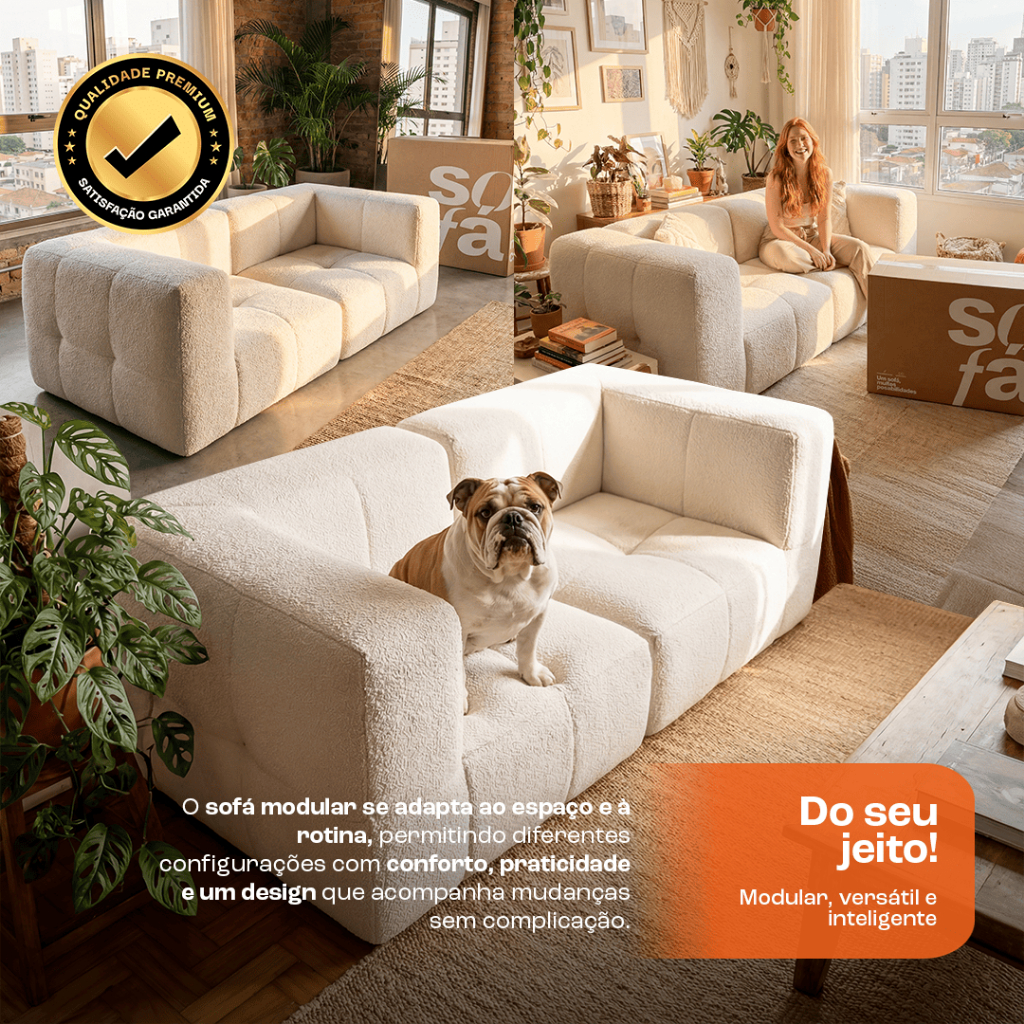 Por que Escolher o Sofá na Caixa? Transforme seu ambiente com um sofá que combina inovação, conforto e estilo. Ideal para quem busca praticidade sem renunciar a sofisticação. Seja um espaço compacto ou amplo, o Sofá Modular Sofá na Caixa é a solução perfeita para sua casa. 🛋️Conforto em primeiro lugar: O Sofá modular possui um assento firme na medida certa, com densidade média/alta para manter seu corpo relaxado e estável por horas. 🍃 Tecido leve ao toque: Revestido com Boucle LuxBlend o Sofá na Caixa possui uma sensação sedosa ao toque, beleza estética e alta durabilidade pet friendly. 🏡 Estilo e Design: O Sofá na Caixa possui um conceito Moderno e minimalista, com cores neutras para se adequar a qualquer ambiente. 🧩 Versátil e Modular: O design modular do Sofá na Caixa permite um sofá para o dia a dia totalmente configurável com formas diferentes para todas as situações. ✔️ Segurança e garantia: Compra 100% segura pelo seller e pelo marketplace – Com garantia de 3 meses e 7 dias para testar na sua casa ⏳ Durabilidade: Possui uma estrutura Monolítica com espuma de alta resiliência além da ausência de costuras ou emendas internas, garantindo consistência e resistência superior. 📦 Entrega Compacta: Chega em caixas pequenas para facilitar o transporte e evitar esforço. 🔗 Fixação Segura: Mecanismo de junção **Fast Click** para estabilidade e ocultamento eficiente. Conforto Revolucionário com Tecnologia GrowTech® Desenvolvido com espuma exclusiva GrowTech®, nosso sofá oferece um conforto inigualável. Criada com matérias-primas de alta qualidade e livre de isopor, essa tecnologia garante durabilidade, maciez e suporte ideal, proporcionando uma experiência de longa durabilidade. Ficha Técnica - Sofá Modular Sofá na Caixa • Entrega Compacta e Montagem Fácil • Entregue em caixas compactas: Facilita o transporte e evita danos. • Montagem descomplicada: basta abrir a caixa, e o sofá se expande automaticamente. • Junção dos módulos: Realizada através de Fast Click na parte inferior do produto, sendo eficiente e ocultando o mecanismo. Materiais da estrutura • Preenchimento e estrutura: Ausência de costuras ou emendas internas, preenchido apenas por espuma GrowTech® • Tecido de Revestimento: Revestido com Boucle LuxBlend Premium Dimensões e Configurações • Dimensão total do módulo: Altura 65cm x Largura 86cm x Comprimento 86cm • Ideal para salas de até 25 m² em sua configuração completa (até 6 módulos). • Disponível em configurações de 1 a 6 módulos, perfeitos para criar ambientes aconchegantes ou espaçosos. Adicione módulos avulsos onde e quando quiser. Benefícios Adicionais • Garantia Estendida: 3 meses contra defeitos de fabricação. • Teste sem Compromisso: 7 dias para experimentar e devolução facilitada. • Sustentabilidade: Produzido com materiais ecologicamente responsáveis.