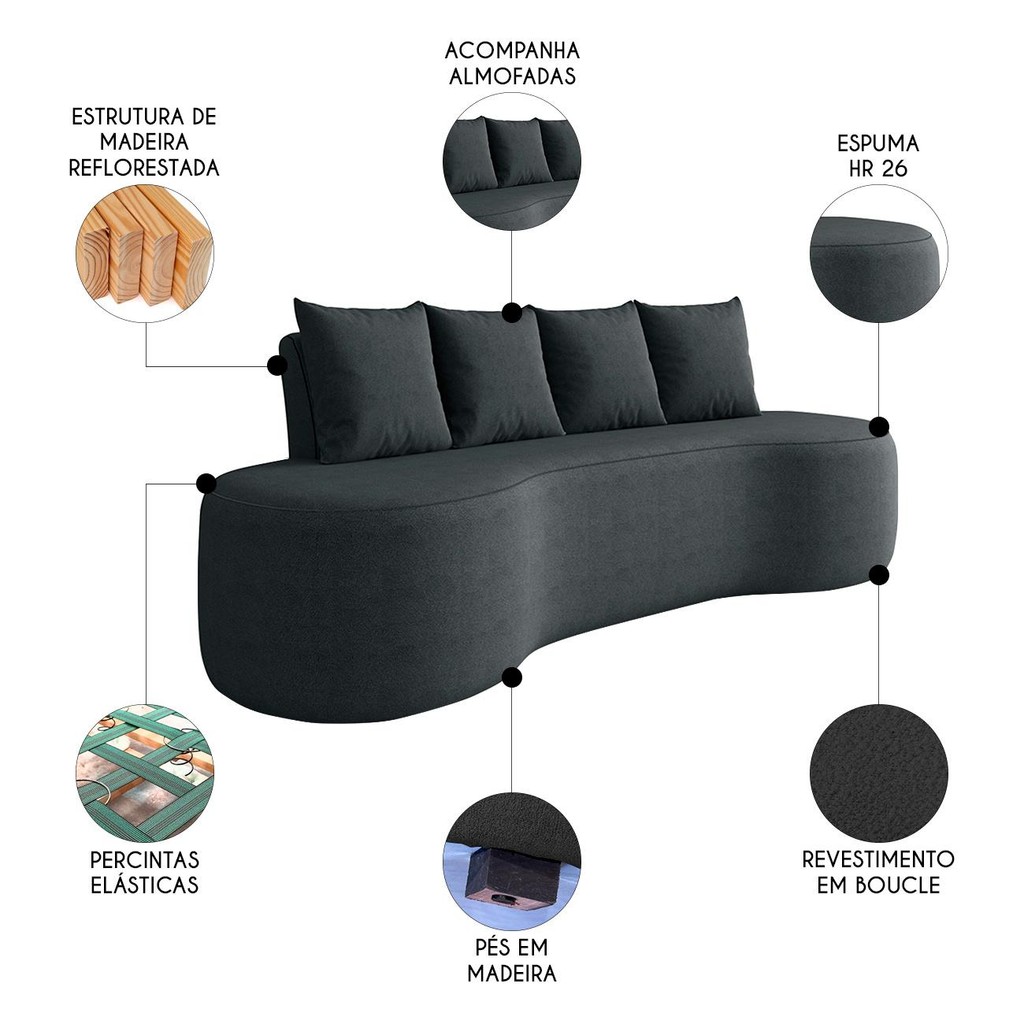 Sofá 3 Lugares 210cm Orgânico Viana B10 Bouclê Grafite - Mpozenato