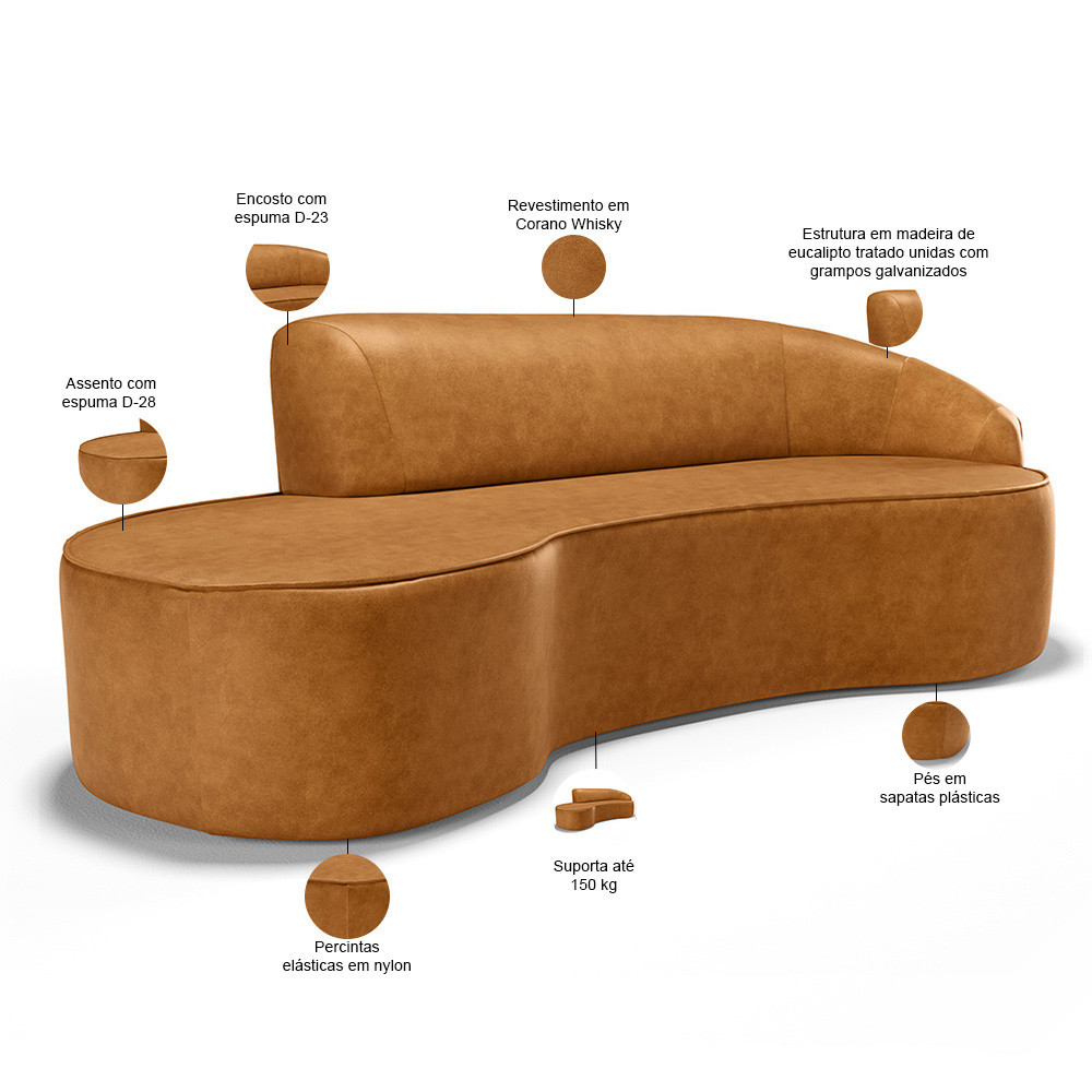 Sofá 3 Lugares Curvo Sala de Estar Living Firenze Direito D02 Couríssimo Whisky 180 cm B-90 - Lyam