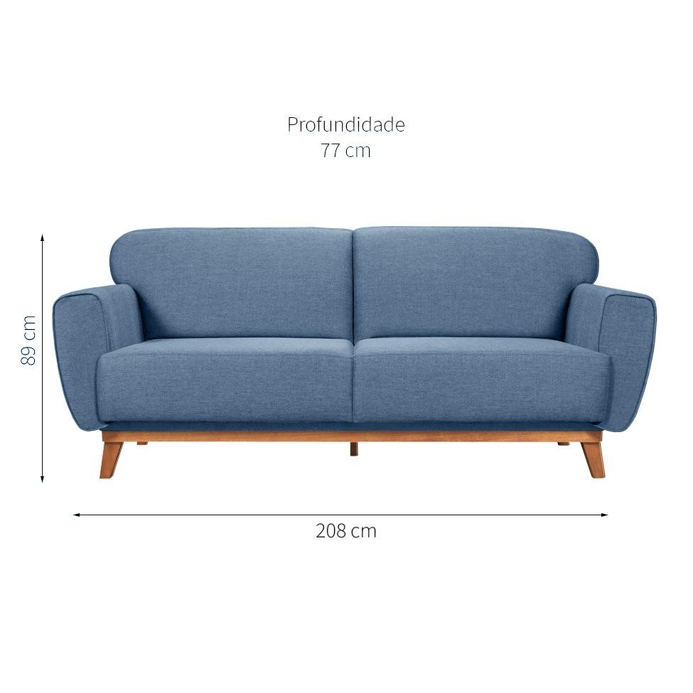 Que tal o Sofá Floret?Um móvel de formas arredondadas e curvas delicadas que busca inspiração na suavidade das pétalas das flores: esse é o Sofá Floret! Escolha ideal para compor o seu principal ambiente de entretenimento, a sala de estar, ele promete contribuir para uma atmosfera mais relaxante sem deixar a personalidade decorativa de lado. Enquanto a estrutura interna em eucalipto reflorestado reforça o uso diário, os pés em madeira maciça agregam valor à peça e dão esse acabamento charmoso ao visual. Já o revestimento em linho na cor azul é perfeito para quem quer fugir do tradicional e adicionar uma tonalidade de destaque ao cômodo. Seja para descansar ou curtir um momento com a família e amigos, ele sempre será bem-vindo em seu doce lar ;) Garantia em Meses: 3 Cores do Produto: Azul Instruções/Cuidados: Limpar com Pano Seco ou Levemente Umedecido Conteúdo da Embalagem: 1 Sofá - Entregue em: 1 Volume Modelo: Fixo Número de Volumes: 1 Material: Estrutura em Eucalipto 25 mm | Pés Fixos em Madeira Tauari | Possui 2 Molas | Assento Fixo com Enchimento em Espuma D28 | Encosto Fixo com Enchimento em Espuma D28 | Revestimento em Tecido Linho Material para Filtro: MDF Descrição do Tamanho: Altura: 89 cm Largura: 208 cm Profundidade: 77 cm Peso Suportado: 100 Kg Altura do Produto (cm): 89 Largura do Produto (cm): 208 Comprimento do Produto (cm): 77 Peso do Produto (Kg): 48 Produto precisa de Montagem?: Sim, instalação dos pés Sofá-Cama: 0 Tipo de Encosto: Fixo Controle Remoto: 0 Desmontável: 0 Quantidade de Peças: 1 Tipo de pé: Fixo Linha de produtos: Floret Tendências: Skandi Acompanha banco/puff: Não É giratório: Não Material da estrutura: Eucalipto Material do enchimento do assento: Espuma D28 Material do enchimento do encosto: Espuma D28 Material do Revestimento: Linho Possui Baú?: Não Tipo de assento: Fixo Material dos pés: Madeira PROFUNDIDADE x LARGURA x ALTURA: 77 x 208 x 89 Fornecedor: SOLDATI IND. E COM. DE MOVEIS - EPP É com chaise: Não É sofá-cama: Não Tipo de produto: Sofá É de canto: Não Baterias são necessárias?: Não Certificação de teste externa: Não Componentes incluídos: Não Is Fragile: Não Número da peça: Não Produto: Sofá É reclinável: Não Quantidade de lugares: 3 Tipo do Sofá: Inclui manual de montagem: Não
