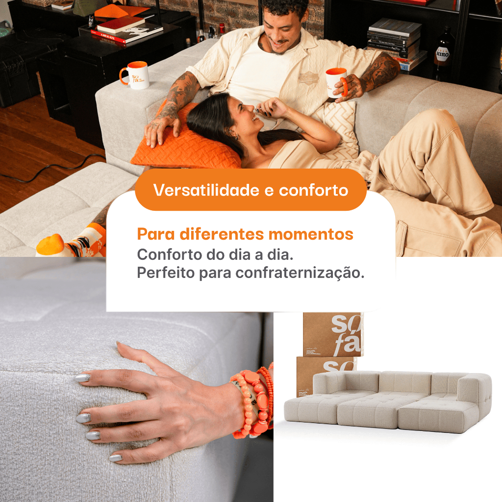 Por que Escolher o Sofá na Caixa? Transforme seu ambiente com um sofá que combina inovação, conforto e estilo. Ideal para quem busca praticidade sem renunciar a sofisticação. Seja um espaço compacto ou amplo, o Sofá Modular Sofá na Caixa é a solução perfeita para sua casa. 🛋️Conforto em primeiro lugar: O Sofá modular possui um assento firme na medida certa, com densidade média/alta para manter seu corpo relaxado e estável por horas. 🍃 Tecido leve ao toque: Revestido com Boucle LuxBlend o Sofá na Caixa possui uma sensação sedosa ao toque, beleza estética e alta durabilidade pet friendly. 🏡 Estilo e Design: O Sofá na Caixa possui um conceito Moderno e minimalista, com cores neutras para se adequar a qualquer ambiente. 🧩 Versátil e Modular: O design modular do Sofá na Caixa permite um sofá para o dia a dia totalmente configurável com formas diferentes para todas as situações. ✔️ Segurança e garantia: Compra 100% segura pelo seller e pelo marketplace – Com garantia de 3 meses e 7 dias para testar na sua casa ⏳ Durabilidade: Possui uma estrutura Monolítica com espuma de alta resiliência além da ausência de costuras ou emendas internas, garantindo consistência e resistência superior. 📦 Entrega Compacta: Chega em caixas pequenas para facilitar o transporte e evitar esforço. 🔗 Fixação Segura: Mecanismo de junção **Fast Click** para estabilidade e ocultamento eficiente. Conforto Revolucionário com Tecnologia GrowTech® Desenvolvido com espuma exclusiva GrowTech®, nosso sofá oferece um conforto inigualável. Criada com matérias-primas de alta qualidade e livre de isopor, essa tecnologia garante durabilidade, maciez e suporte ideal, proporcionando uma experiência de longa durabilidade. Ficha Técnica - Sofá Modular Sofá na Caixa • Entrega Compacta e Montagem Fácil • Entregue em caixas compactas: Facilita o transporte e evita danos. • Montagem descomplicada: basta abrir a caixa, e o sofá se expande automaticamente. • Junção dos módulos: Realizada através de Fast Click na parte inferior do produto, sendo eficiente e ocultando o mecanismo. Materiais da estrutura • Preenchimento e estrutura: Ausência de costuras ou emendas internas, preenchido apenas por espuma GrowTech® • Tecido de Revestimento: Revestido com Boucle LuxBlend Premium Dimensões e Configurações • Dimensão total do módulo: Altura 65cm x Largura 86cm x Comprimento 86cm • Ideal para salas de até 25 m² em sua configuração completa (até 6 módulos). • Disponível em configurações de 1 a 6 módulos, perfeitos para criar ambientes aconchegantes ou espaçosos. Adicione módulos avulsos onde e quando quiser. Benefícios Adicionais • Garantia Estendida: 3 meses contra defeitos de fabricação. • Teste sem Compromisso: 7 dias para experimentar e devolução facilitada. • Sustentabilidade: Produzido com materiais ecologicamente responsáveis.
