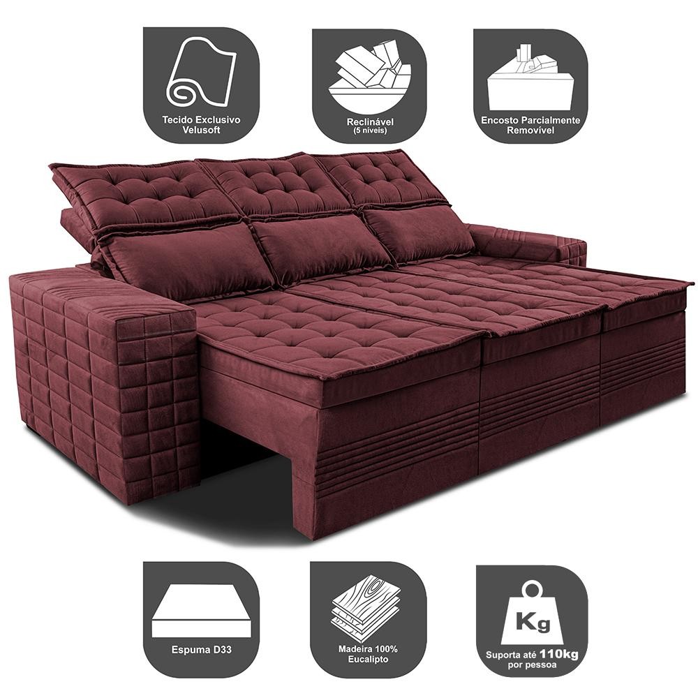 Sofá 3 Lugares Retrátil e Reclinável Cama inBox Senses 2,00m Velusoft Vinho