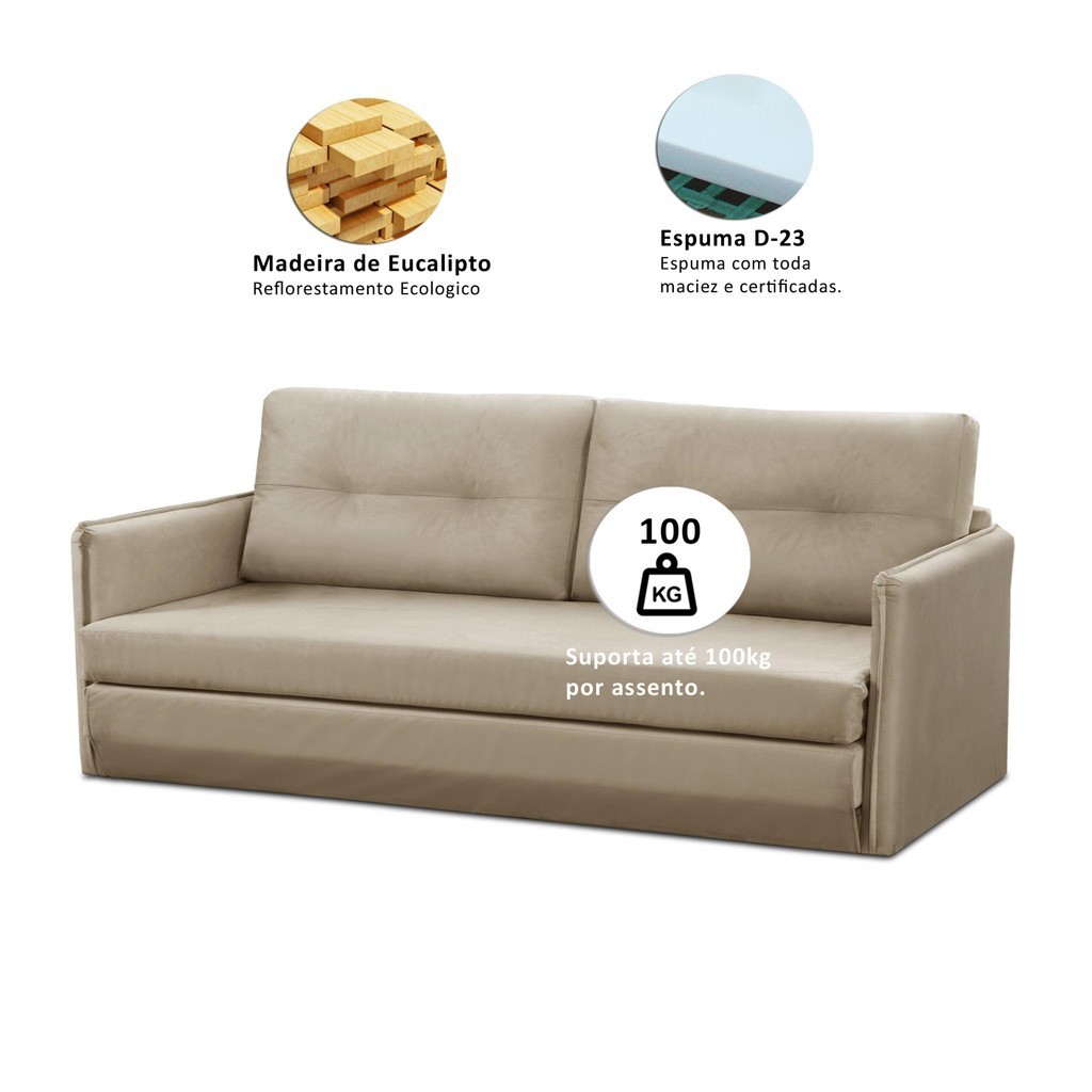 Sofá Cama Luisa multifuncional: conforto e praticidade em um único móvel, perfeito para receber visitas ou relaxar durante o dia.; Medidas do Produto Montado: - Largura: 1,50m - Altura: 0,83m - Profundidade total fechado: 0,80m - Profundidade total aberto: 2,10m - Largura de assento: 1,38m - Profundidade do assento (sofá): 0,60m - Profundidade do assento (cama): 2,10m - Altura do assento ao final da almofada: 0,52m - Braço: 6cm - Chão ao assento: 0,40m - Chão ao Final do Braço: 0,60m Especificações Técnicas: Encosto:Composto por 2 Almofadas preenchidas de 80% fibra e 20% flocos, para proporcionar maciez e qualidade. Assento:Composto por Espuma D-23 que garante a melhor qualidade para o conforto e durabilidade do assento. Estrutura:Sua estrutura é toda composta por madeira de eucalipto 100% reflorestada, fixada por grampos galvanizados que vão fazer todo o trabalho de manter uma estrutura firme, com alta qualidade e durabilidade. Informações relevantes: - Esse produto suporta de 100kg por assento. Garantia 90 dias após o recebimento do produto. Instruções de limpeza:Utilizar um pano limpo e seco.Não limpe com escovas ou produtos abrasivos. Observações importantes: - As imagens são meramente ilustrativas, não acompanham objetos de decoração e eletros; - As cores dos produtos podem sofrer alterações dependendo do seu monitor, tela de celular ou lote do tecido. - Todos os produtos vão embalados com total segurança; - Confira a embalagem e o produto no ato da entrega, caso o produto esteja em desacordo recuse imediatamente. - Não nos responsabilizamos no ato de entrega por montagens, desmontagens, instalações de produtos, nem uso de guinchos ou equipamentos para acesso a pisos superiores em apartamentos. - Confira as dimensões do produto no momento da compra e certifique-se de que passará por escadas, elevadores, portas e corredores. Observando as orientações acima, evita-se futuros desagrados ou imprevistos com a entrega do produto. CASO TENHA, A MONTAGEM DO PRODUTO É DE RESPONSABILIDADE DO COMPRADOR, NÃO EFETUAMOS A MONTAGEM DO PRODUTO. *As transportadorasNÃO SOBEMescadas, elevadores e não adentram residências* - A entrega será feita até a porta ou portaria do endereço no qual o pedido foi feito, qualquer necessidade de movimentação do produto até o local onde ele será utilizado é de inteira responsabilidade do CLIENTE, caso haja algum dano ou qualquer coisa do tipo no produto durante a movimentação NÃO NOS RESPONSABILIZAMOS.