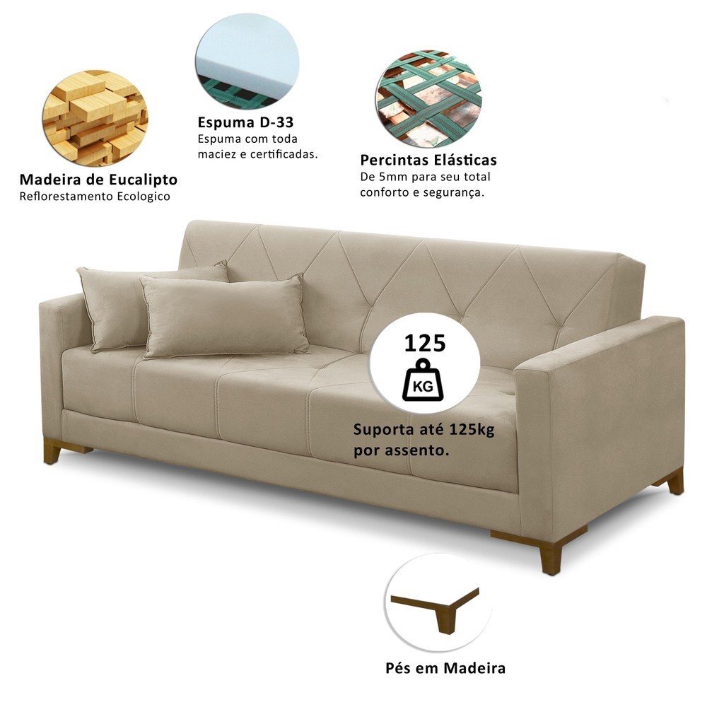 Sofá Cama 3 lugares 2,00m Aurora Suede Bege Adonai Estofados
