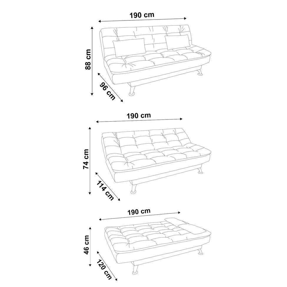 Que tal o Sofá-Cama Premium?Dono de um visual que promete levar sofisticação e aconchego para a sua casa, o Sofá-Cama Premium vai renovar os seus dias de descanso, além de ser uma peça digna de elogios em qualquer decoração. Por dentro, ele tem madeira de reflorestamento na composição, uma ótima característica para o uso diário. Já por fora, o couro sintético faz com que todo mundo tenha vontade de ficar nele sem hora para sair, assim como aprimora os seus momentos de lazer em frente à televisão. Ah, para fechar com chave de ouro, ele se transforma rapidamente de sofá para cama para se adaptar à sua rotina e necessidades. Muitos benefícios para um lar que merece ser igualmente incrível ;) Garantia em Meses: 3 Cores do Produto: Branco Conteúdo da Embalagem: 1 Sofá-Cama - Entregue em: 1 Volume Modelo: Sofá-Cama Número de Volumes: 1 Material: Estrutura em madeira de reflorestamento (eucalipto e pinus) seca e tratada, chapas de OSB com sistemas flex Material para Filtro: Revestimento Sintético Descrição do Tamanho: Aberto: Altura: 88 cm | Largura: 190 cm | Profundidade: 120 cm/ Fechado: Altura: 46 cm | Largura: 190 cm | Profundidade: 96 cm Altura do Produto (cm): 88 Largura do Produto (cm): 190 Comprimento do Produto (cm): 96 Peso do Produto (Kg): 36 Produto precisa de Montagem?: Sim, instalação dos pés Sofá-Cama: 0 Tipo de Encosto: Reclinável Controle Remoto: 0 Desmontável: 0 Quantidade de Peças: 1 Tipo de pé: Fixo Altura do assento até o chão (cm): 46 Linha de produtos: Premium Imagem Ambientada: Sim Acompanha banco/puff: Não É giratório: Não Material da estrutura: Pinus Material do enchimento do assento: Espuma D33 Material do enchimento do encosto: Espuma D26 Material do Revestimento: Revestimento Sintético Possui Baú?: Não Tipo de assento: Fixo Material dos pés: Metal PROFUNDIDADE x LARGURA x ALTURA: 96 x 190 x 88 Fornecedor: Linoforte Móveis Ltda É com chaise: Não Tipo de produto: Sofá-Cama É sofá-cama: Sim É de canto: Não Quantidade de lugares: Não Baterias são necessárias?: Não Certificação de teste externa: Não Componentes incluídos: Não Is Fragile: Não Número da peça: Não Produto: Sofá-Cama É reclinável: Sim Quantidade de Lugares: 3 Inclui manual de montagem: Não
