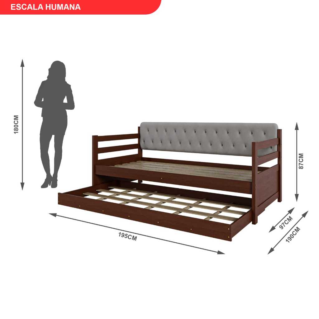 Belo, combinando a madeira com a tapeçaria capitonê em tecido de cor bege, entrega elegância, moderniade e conforto em um só móvel, para seu ambíente. Possui aquela praticidade que buscamos hoje, durante o dia, ele é um elegante sofá para receber seus convidados e à noite, se transforma em uma confortável cama para você ou seus hóspedes descansarem. Estilo: Retrô Garantia: 03 Meses Acabamento: Verniz Possui Pés: 2 Tipo de Cama: Bicama Possui Nichos: Não Possui Portas: Não Possui Gavetas: Não Tamanho da Cama: Solteiro Tipo de Estrado: Fixo Escala de Brilho: Semi-Brilho Material dos Pés: Madeira Maciça Origem do Produto: Nacional Acabamento dos Pés: Verniz Ambiente Principal: Quarto Material Principal: Madeira Maciça Possui Prateleiras: Não Tipo de Madeira Maciça: Pinus Tipo de Madeira Maciça dos Pés: Pinus Cor Predominante: Marrom Extensível: Sim Possui Baú: Não Possui Grade: Não Possui Rodízio: Sim Acompanha Colchão: Não Rodízio com Trava: Não Possui Escrivaninha: Não Sapatas Niveladoras: Não Acompanha Cama Auxiliar: Sim Cama Auxiliar com Rodízio: Sim Possui Trava de Segurança: Não Cama Auxiliar Acompanha Colchão: Não Permite a Utilização de Cama Auxiliar: Não Marca: Atraente Móveis Cor do Produto: Castanho Itens Inclusos: Sofá Cama solteiro + cama auxiliar solteiro + manual de montagem. Tamanho do Colchão Indicado (L x C): 88 cmx 188 cm Tamanho do Colchão Indicado Cama Auxiliar (L x C): 88cm X 188cm Peso (kg): 36 Altura (cm): 87 Altura dos Pés: 5 Comprimento (cm): 195 Largura Máxima: 190 Largura Mínima: 97 Suporta Até (kg): 120 Profundidade (cm): 97 Altura do Estrado até o Chão: 35 Cama Auxiliar Suporta Até (kg): 120 Informações Complementares (Novo): Peso suportado de 120 kg por pessoa, em cada uma das camas, totalmente distribuidos pelo colchão. Sarrafos de Madeira e Ripas em MDF. Não acompanha colchão.