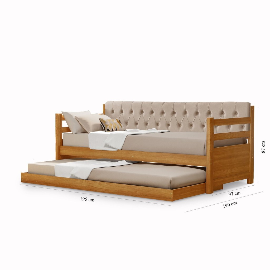 Belo, combinando a madeira com a tapeçaria capitonê em tecido de cor bege, entrega elegância, moderniade e conforto em um só móvel, para seu ambíente. Possui aquela praticidade que buscamos hoje, durante o dia, ele é um elegante sofá para receber seus convidados e à noite, se transforma em uma confortável cama para você ou seus hóspedes descansarem. Estilo: Retrô Peso (kg): 36 Garantia: 03 Meses Altura (cm): 87 Acabamento: Verniz Possui Baú: Não Possui Pés: Sim Possui Grade: Não Tipo de Cama: Bicama Possui Nichos: Não Possui Portas: Não Altura dos Pés: 5 Comprimento (cm): 195 Possui Gavetas: Não Possui Rodízio: Sim Suporta Até (kg): 120 Possui Espelhos: Não Tamanho da Cama: Solteiro Tipo de Estrado: Fixo Escala de Brilho: Semi-Brilho Material dos Pés: Madeira Maciça Acompanha Colchão: Não Origem do Produto: Nacional Rodízio com Trava: Não Acabamento dos Pés: Verniz Ambiente Principal: Quarto Material Principal: Madeira Maciça Possui Prateleiras: Não Possui Escrivaninha: Não Sapatas Niveladoras: Não Tipo de Madeira Maciça: Pinus Acompanha Cama Auxiliar: Sim Cama Auxiliar com Rodízio: Sim Possui Trava de Segurança: Não Altura do Estrado até o Chão: 35 Cama Auxiliar Suporta Até (kg): 120 Tipo de Madeira Maciça dos Pés: Pinus Cama Auxiliar Acompanha Colchão: Não Informações Complementares (Novo): Peso suportado de 120 kg por pessoa, em cada uma das camas, totalmente distribuidos pelo colchão. Sarrafos de Madeira e Ripas em MDF. Não acompanha colchão. Permite a Utilização de Cama Auxiliar: Não Marca: Atraente Móveis Cor: Imbuia Cor do Produto: Imbuia Itens Inclusos: Sofá Cama solteiro + cama auxiliar solteiro + manual de montagem. Cor Predominante: Bege Tamanho do Colchão Indicado (L x C): 88 cmx 188 cm Tamanho do Colchão Indicado Cama Auxiliar (L x C): 88cm X 188cm