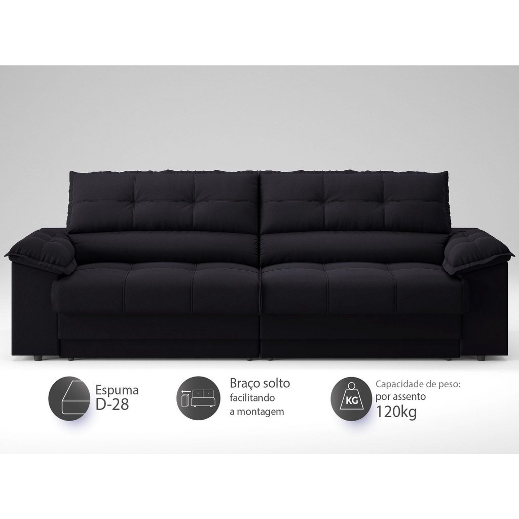 Sofá com Carregador USB Retrátil Reclinável Mimo 2,30m Velosuede Preto - NETSOFAS