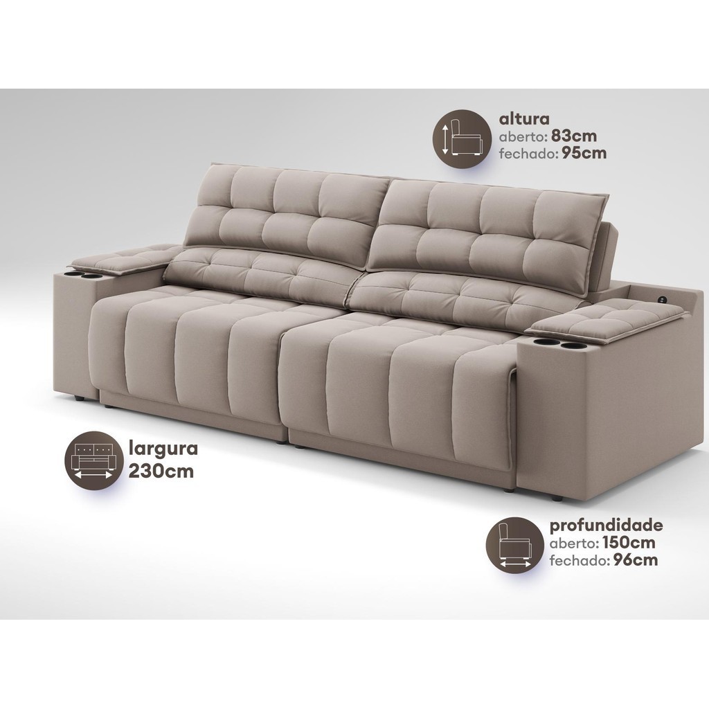 Sofá com Porta Copos Carregador USB Ret Rec Samurai 2,30m Velosuede Bege - NETSOFAS