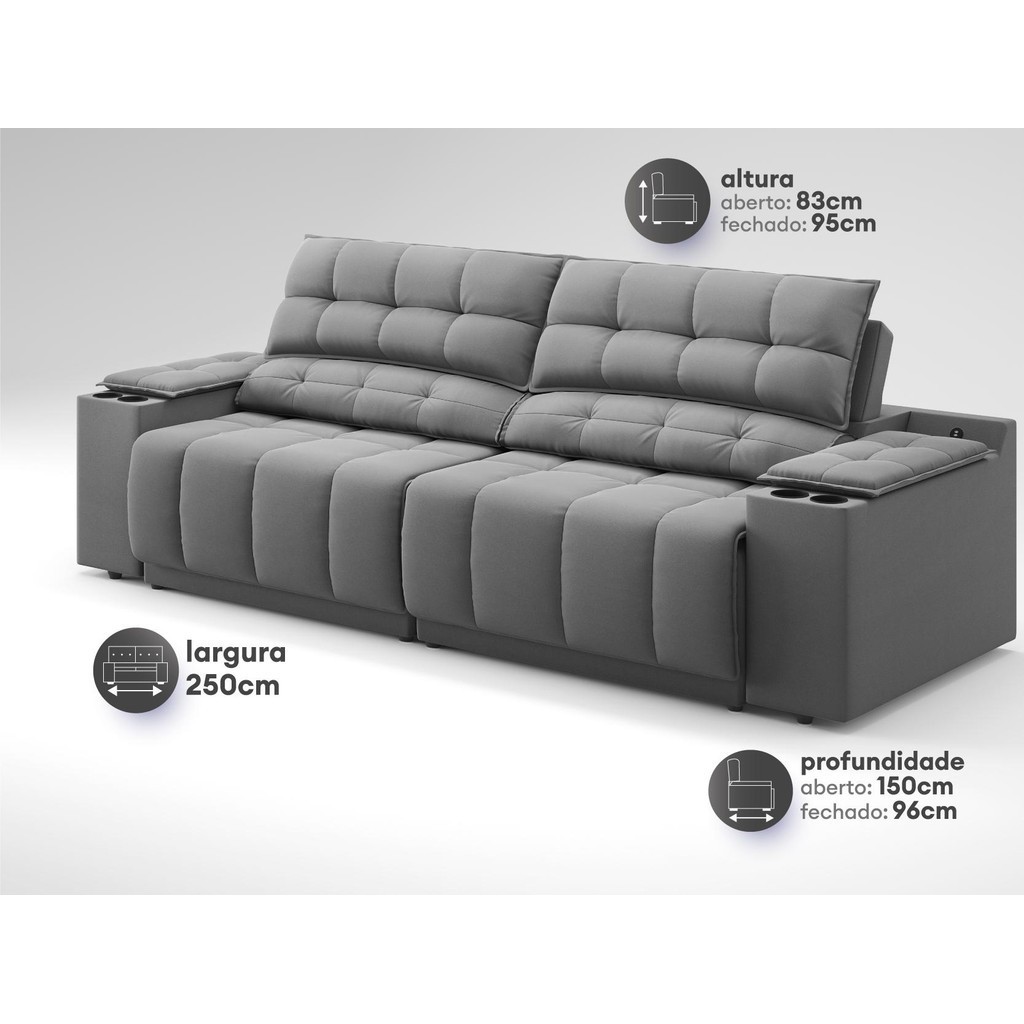 Sofá com Porta Copos Carregador USB Ret Rec Samurai 2,50m Velosuede Grafite - NETSOFAS