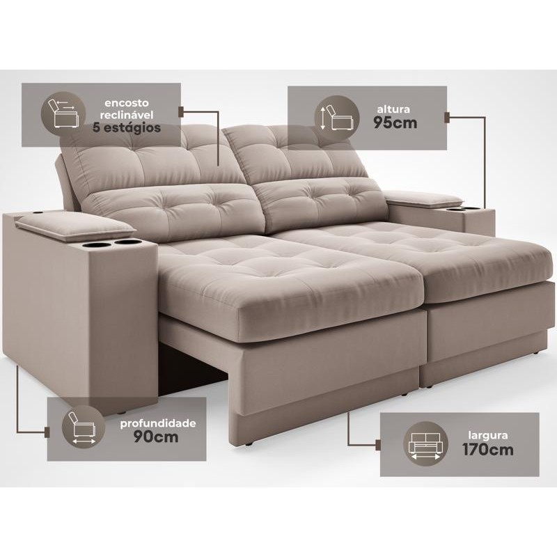 Sofá com Porta Copos e Carregador USB Eureka 1,70m Assento Retrátil e Reclinável Velosuede Bege - NETSOFAS
