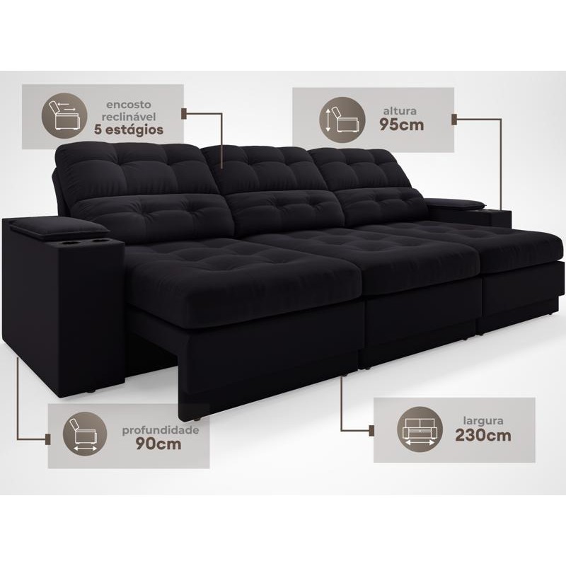 Sofá com Porta Copos e Carregador USB Eureka 2,30m Assento Retrátil e Reclinável Velosuede Preto - NETSOFAS