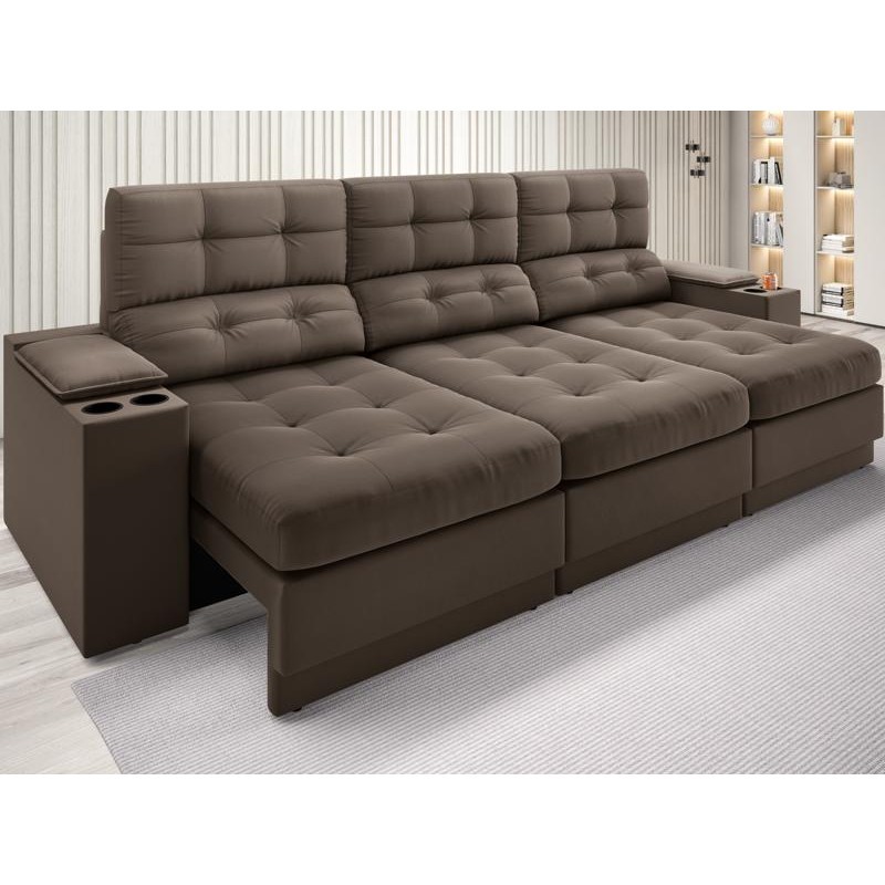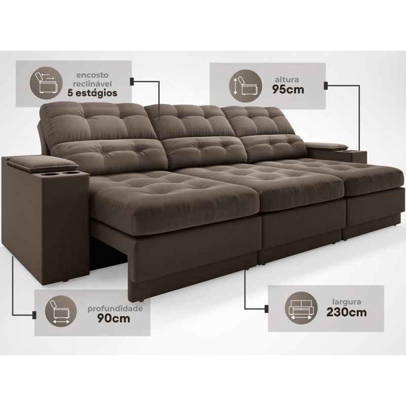 Sofá com Porta Copos e Carregador USB Eureka 2,30m Assento Retrátil e Reclinável Velosuede Marrom - NETSOFAS