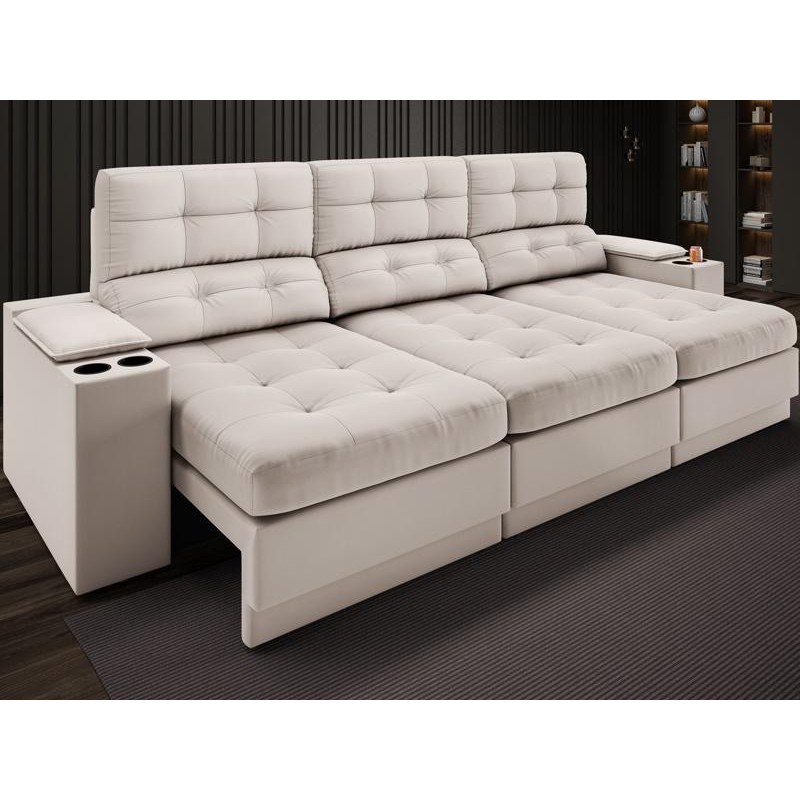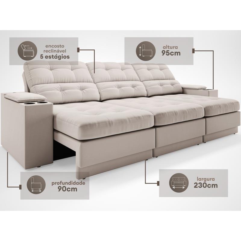 Sofá com Porta Copos e Carregador USB Eureka 2,30m Assento Retrátil e Reclinável Velosuede Areia - NETSOFAS