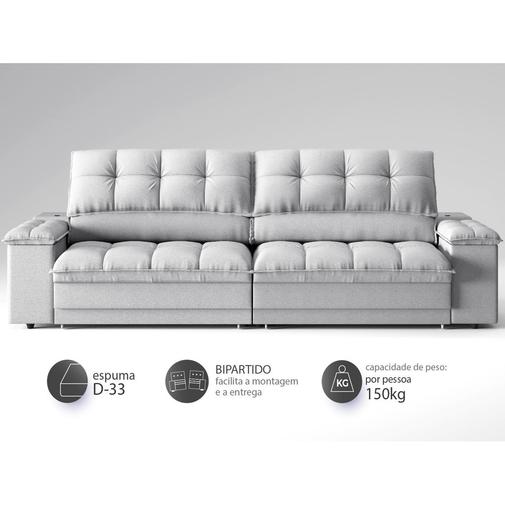 Sofá com Porta Copos e Carregador USB Ret Rec Luke 2,50m Linho Soft Prata - NETSOFAS