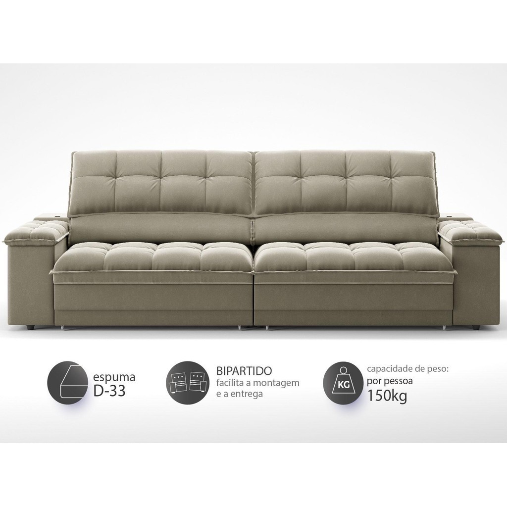 Sofá com Porta Copos e Carregador USB Ret Rec Luke 2,50m Veludocristal Fendi - NETSOFAS