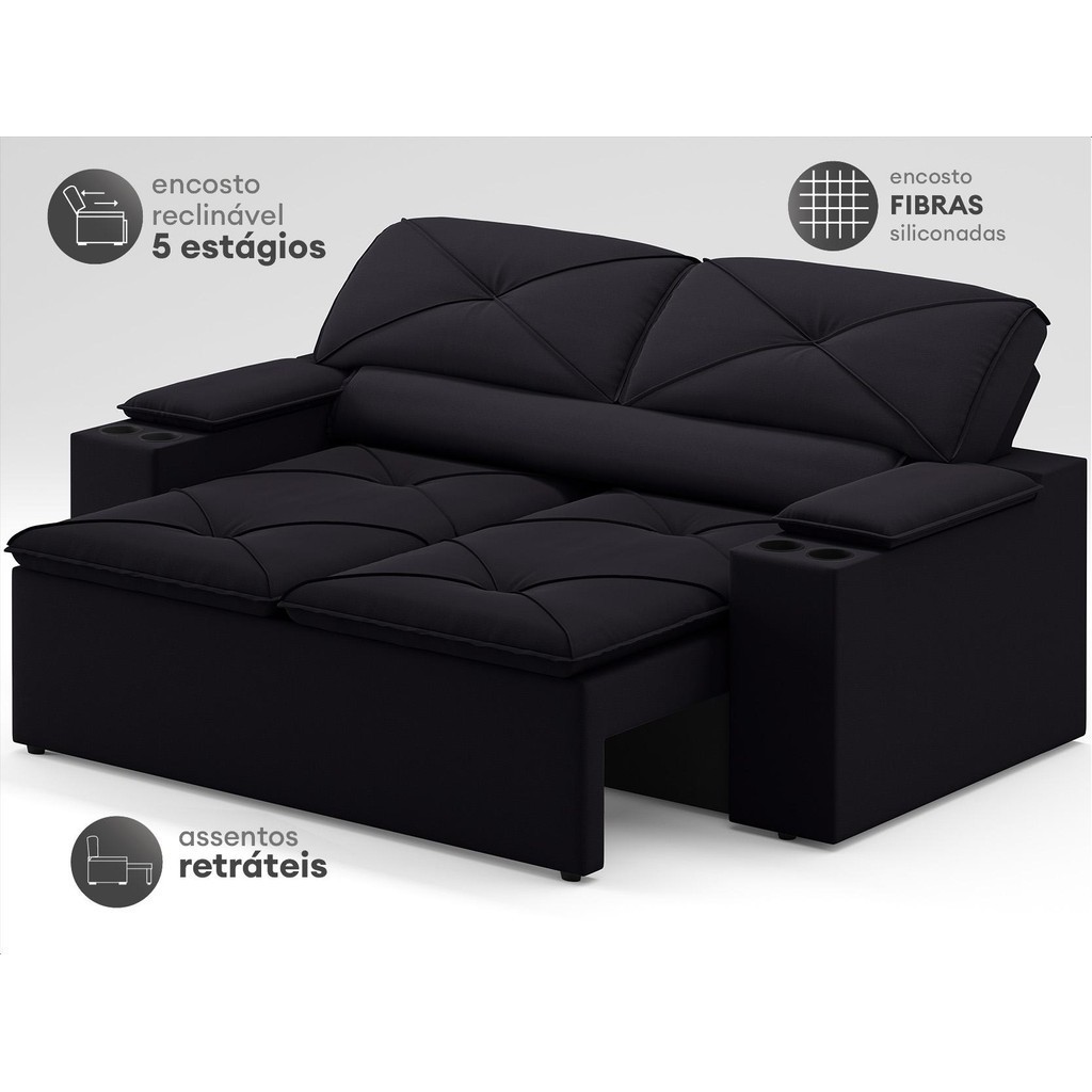 Sofá com Porta Copos Retrátil e Reclinável Pop 1,54m Velosuede Preto - NETSOFAS