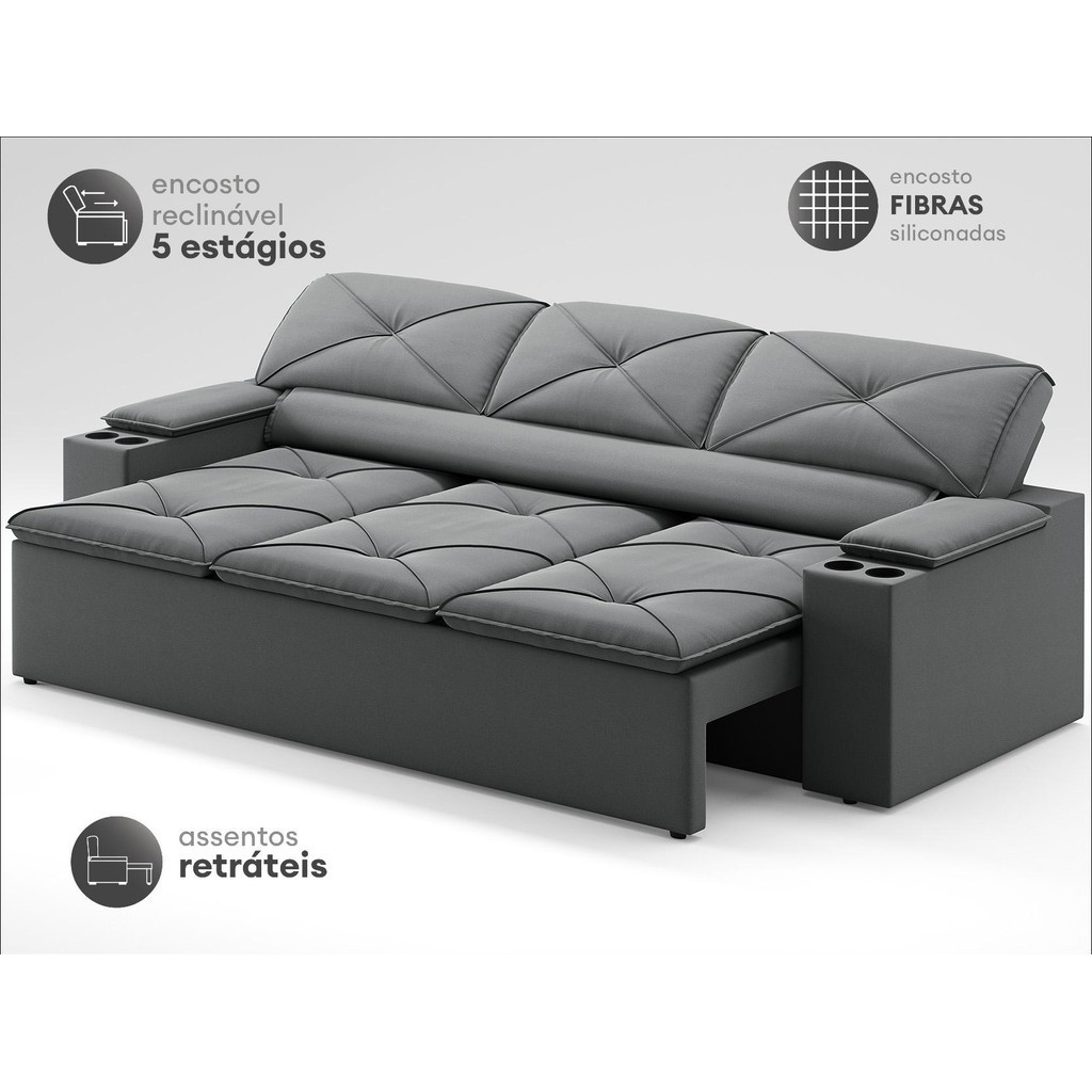 Sofá com Porta Copos Retrátil e Reclinável Pop 2,05m Velosuede Grafite - NETSOFAS