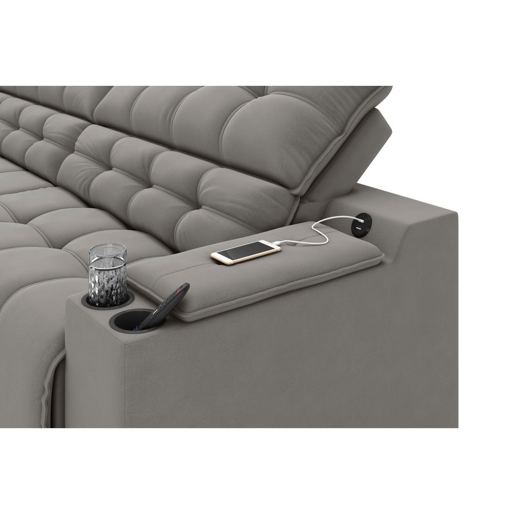Sofá Connect Premium 2,00m Assento Retrátil/Reclinável com porta copos e entrada USB Suede Cinza