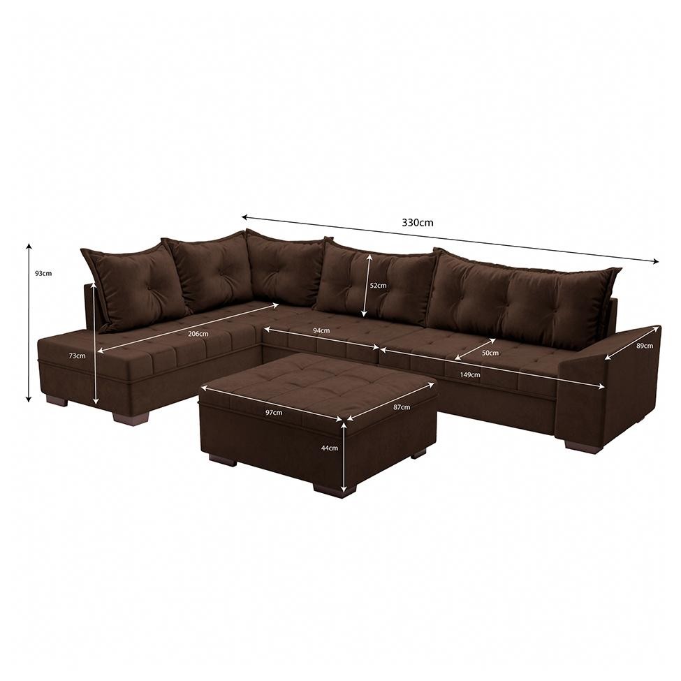 Que tal o Sofá de Canto Itapema? Uma casa aconchegante está entre seus sonhos, né? E nada como um amplo sofá de canto para receber toda a família e proporcionar bons momentos a todos. Feito em materiais duráveis e resistentes, o modelo Itapema não só tem estrutura em eucalipto, como traz fibra e flocos no encosto, espuma D23 no assento e revestimento em Veludo - o combo perfeito para acomodar bem. Ah, notou que, além do sofá de canto, ele já tem puff para esticar os pés? Ou pode até servir de assento extra nos dias de casa cheia! Tudo isso ainda acompanha um design moderno com coloração simples de inserir no ambiente. Com ele, sua casa vai ficar cheia de bom gosto e conforto :) Cor: Marrom Garantia em Meses: 3 Cores do Produto: Marrom Instruções/Cuidados: Não expor a luz do sol Conteúdo da Embalagem: 1 Sofá e 1 Puff - Entregue em: 4 Volumes Modelo: De Canto Número de Volumes: 4 Material: O Sofá de Canto Itapema possui estrututura em eucalipto 22mm, enchiemento do encosto em fibra e flocos, enchimento do assento em espuma D23 e revestimento em veludo. Material para Filtro: Eucalipto Descrição do Tamanho: Sofá: Altura: 93 cm | Largura: 330 cm | Profundidade: 206 cm / Puff: Altura: 44 cm | Largura: 97 cm | Profundidade: 87 cm Altura do Produto (cm): 93 Largura do Produto (cm): 330 Comprimento do Produto (cm): 206 Peso do Produto (Kg): 101 Produto precisa de Montagem?: Sim, sugerimos a contratação do nosso serviço de montagem (para os CEPs em que o serviço está disponível) ou de algum profissional experiente de sua preferência Tipo de Encosto: Fixo Tipo de pé: Fixo Altura do assento até o chão (cm): 44 Material da estrutura: Eucalipto Material do enchimento do assento: Espuma D23 Material do enchimento do encosto: Fibra Material do Revestimento: Veludo Possui Baú?: Não Tipo de assento: Fixo Material dos pés: Plástico PROFUNDIDADE x LARGURA x ALTURA: 206 x 330 x 93 Fornecedor: MONTREAL MONTADORA DE MOVEIS E ELETRODOMESTICOS LTDA É com chaise: Sim Tipo de produto: Sofá É sofá-cama: Não É de canto: Sim Baterias são necessárias?: Não Certificação de teste externa: Não Componentes incluídos: Não Is Fragile: Não Número da peça: Não Produto: Sofá Quantidade de lugares: 6 Inclui manual de montagem: Não