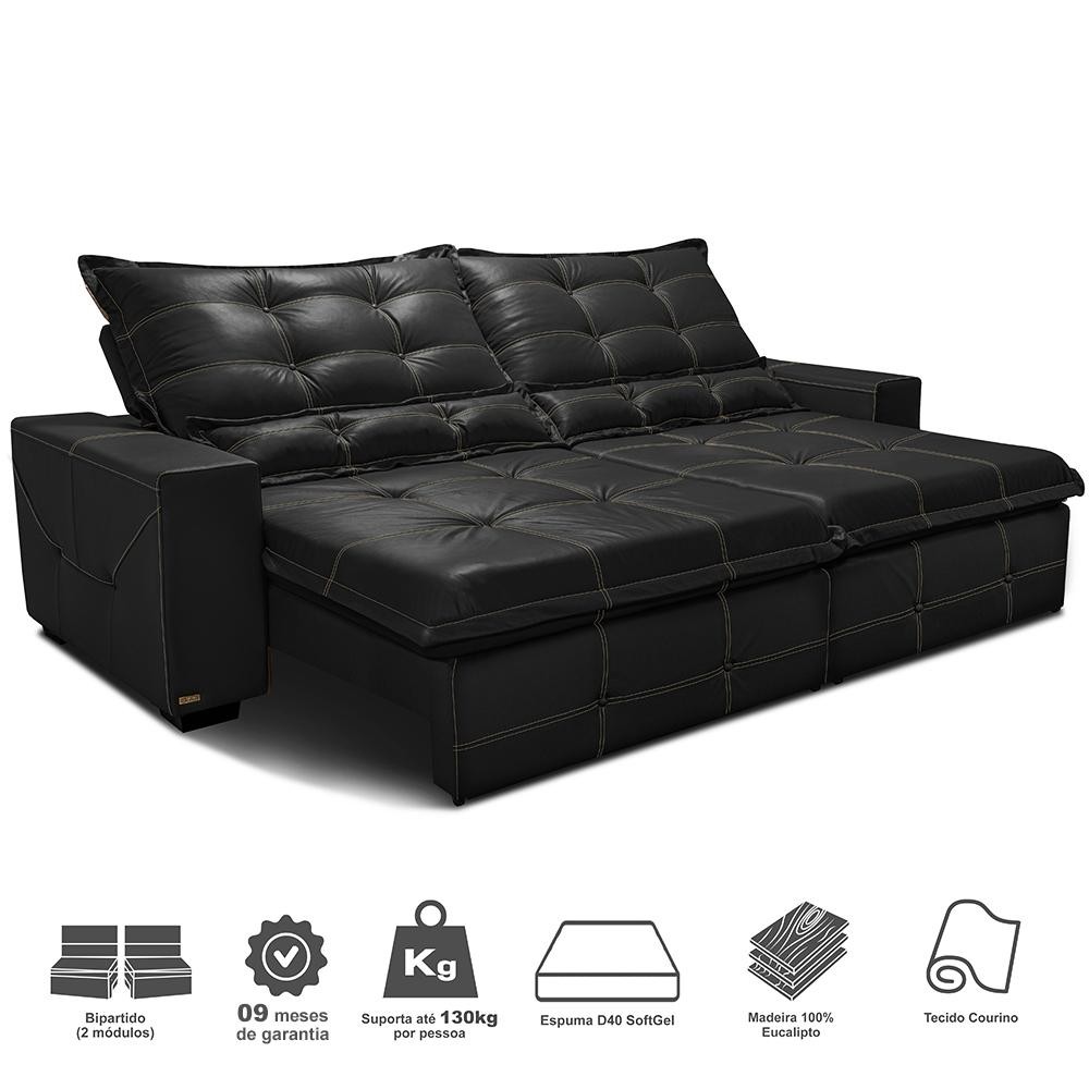 Sofá de Courino Retrátil e Reclinável 2,15m Cama inBox Bourbon SoftGel D40 Preto