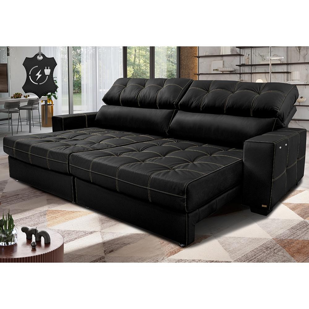 Sofá de Couro Elétrico Retrátil 2,55m Molas Ensacadas Cama inBox Gran Majesty Preto