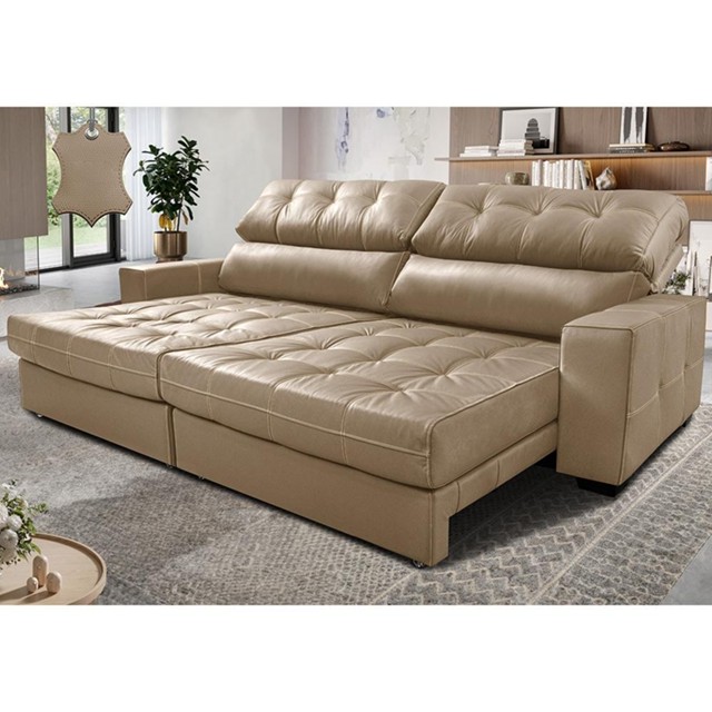 Sofá de Couro Legítimo Retrátil e Reclinável 2,15m Molas Ensacadas Cama inBox Majesty Bege