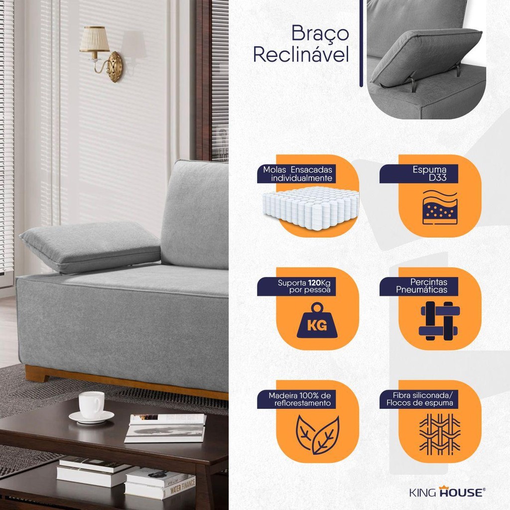 Sofá Living Braço Articulado Deluxe 2,30m Bouclê Cinza
