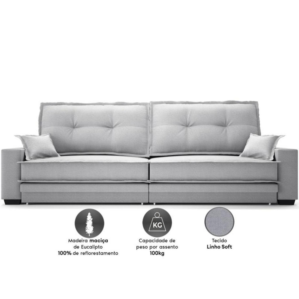Exclusividade com requinte NETSOFAS. Se você busca por um SOFÁ para transformar sua sala de estar, vai se apaixonar pelo SOFÁ PALERMO. Disponível em várias medias, ele é aconchegante e possui um visual que vai elevar a decoração do espaço para outro nível. A base em madeira e as espumas de diferentes densidades são a cereja do bolo. Prontinho, você encontrou o item que faltava para sua sala! Agora é só clicar em comprar! Vamos, me leva! Informações técnicas: Material da estrutura:Madeira Maciça de Eucalipto 100% de reflorestamento,produto ecologicamente correto. Enchimento do Assento: ESPUMA D-33, Manta acrílica Siliconada, Percinta Elástica e Mola Bonnel.Enchimento do Encosto: Flocos de Espuma, Fibra de Poliéster Siliconada e Percinta Elástica. Fixação da Estrutura:Grampos galvanizados antiferrugem. Revestimento / Tecido:LINHO SOFT.. Chaise: Não Possui. ACOMPANHAM 02 LINDAS ALMOFADAS. AGREGANDO MAIS CHARME E PRATICIDADE ao SOFÁPALERMO. Praticidade: Modelo bipartido, facilitando o transporte por corredores estreitos e escadas. Medidas: Altura aproximada: 100cm (fechado) e 90cm (aberto).Largura aproximada:220cm. Profundidade aproximada: 115cm (fechado) e 175cm (aberto). Peso aproximado:86kg. Necessita Montagem:Não. Necessita Montador Especializado: Não. Pode ser montado por uma pessoa sozinha. Capacidade em KG por Lugar:Aproximadamente100kg.*distribuídos igualmente sobre a área do assento. Garantia:3 meses contra defeito de fabricação.*a contar da data do recebimento da mercadoria. Limpeza:Aspirar o Produto para Eliminar a Poeira,utilizarum pano levemente umedecido com águae sabão neutro, seguido de pano seco.Não limpar com escovas ou produtos abrasivos. Recomendações de Manutenção:Usar em local seco, não molhar. Evitar exposição ao sol, para que o produto não sofra alterações natonalidade. ATENÇÃO! A tonalidade do produto pode variar entre a imagem de exibição e o item físico. Imagens meramente ilustrativas. Não nos responsabilizamos pela montagem/instalação dos produtos. -Os objetos que ambientam as fotos não acompanham o produto. - Verifique as dimensões do produto e certifique-se que o percurso que ele fará até o local de uso permite sua passagem. Nós não nos responsabilizamos por transporte de produtos, caso não caibam em elevadores, acima de três lances de escada e não cabendo na passagem das escadas, por içamentos ou desmontagens de produtos. Quaisquer despesas deste tipo ficam a cargo do cliente. -Reservamo-nos o direito depossíveis erros de digitação.Anúnciosujeito a alteração semavisoprévio. -Antes da entrega, nossos produtos passam por um rigoroso controle de qualidade para que cheguem até o cliente em perfeitas condições, entretanto, em casos de desacordo com o proposto, o comprador deverá contatar o nosso SACe/ou a loja aonde a compra foi efetuada. -O prazo para solucionar os problemas identificados é de até 30 dias úteis, contados a partir da data do posicionamento do SAC com o comprador.