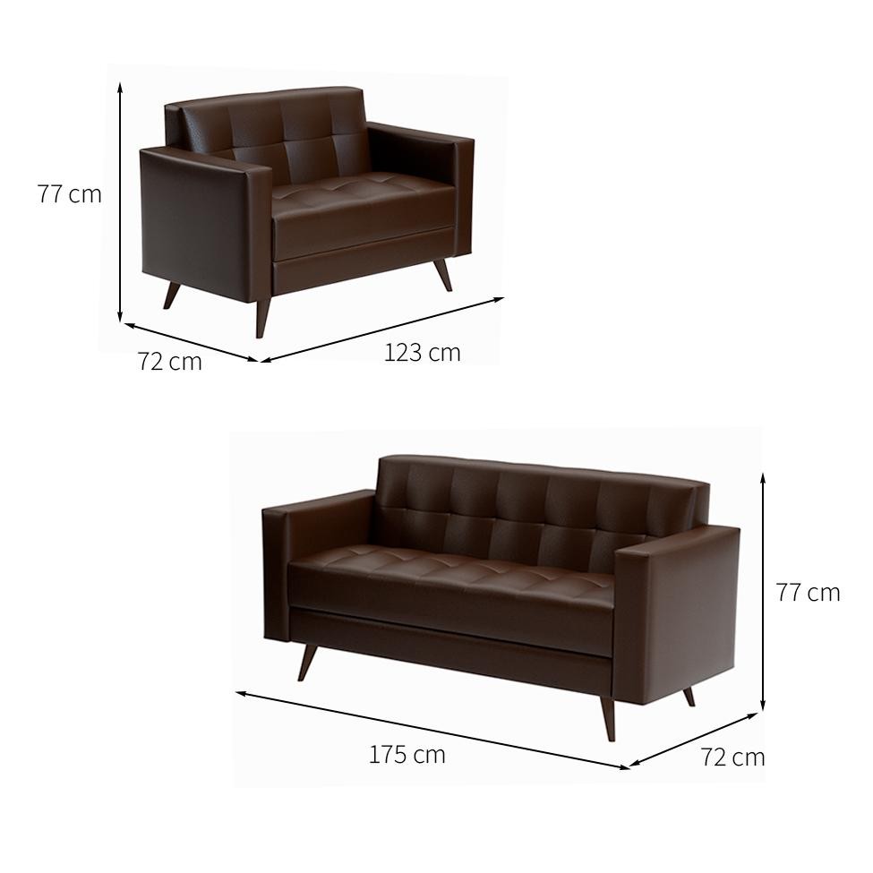 Que tal o Conjunto de Sofá e Poltrona Vitrola?Uma casa aconchegante está entre seus sonhos, né? Para começar pela sala de estar, pode apostar na comodidade e no visual do Conjunto Vitrola. Com estrutura reforçada para o uso diário, o sofá e a poltrona são a opção certa para você relaxar nos momentos de lazer, seja assistindo TV ou lendo um bom livro - o estofamento em materiais propícios para o uso contínuo e o revestimento macio recebem bem o corpo, levando todo o bem-estar que você merece. Com design que usa linhas retas, os móveis levam um ar clássico para a casa, ao mesmo tempo que são simples de combinar com qualquer estilo de decoração. Seu lar-style ficará impecável! Cor: Marrom Garantia em Meses: 3 Cores do Produto: Marrom Instruções/Cuidados: Não expor a luz do sol Conteúdo da Embalagem: 2 Sofás - Entregue em: 2 Volumes Modelo: Fixo Número de Volumes: 2 Material: O Conjunto Vitrola possui estrutura em eucalipto 22mm, encosto e assento com enchimento em espuma D23 e revestimento sintético Material para Filtro: Eucalipto Descrição do Tamanho: Sofá I: Altura: 77 cm | Largura: 175 cm | Profundidade: 72 cm / Sofá II: Altura: 77 cm | Largura: 123 cm | Profundidade: 72 cm Altura do Produto (cm): 77 Largura do Produto (cm): 175 Comprimento do Produto (cm): 72 Peso do Produto (Kg): 38 Produto precisa de Montagem?: Sim, a montagem é simples mas sugerimos a contratação do nosso serviço de montagem (para os CEPs em que o serviço está disponível) ou de algum profissional experiente de sua preferência Sofá-Cama: 0 Tipo de Encosto: Fixo Controle Remoto: 0 Desmontável: 0 Possui Baú?: Não Tipo de assento: Fixo PROFUNDIDADE x LARGURA x ALTURA: 72 x 175 x 77 Fornecedor: MONTREAL MONTADORA DE MOVEIS E ELETRODOMESTICOS LTDA É com chaise: Não Tipo de produto: Sofá É de canto: Não É sofá-cama: Não Baterias são necessárias?: Não Certificação de teste externa: Não Componentes incluídos: Não Is Fragile: Não Número da peça: Não Produto: Sofá Quantidade de lugares: 5 Tipo do Sofá: null Inclui manual de montagem: Não
