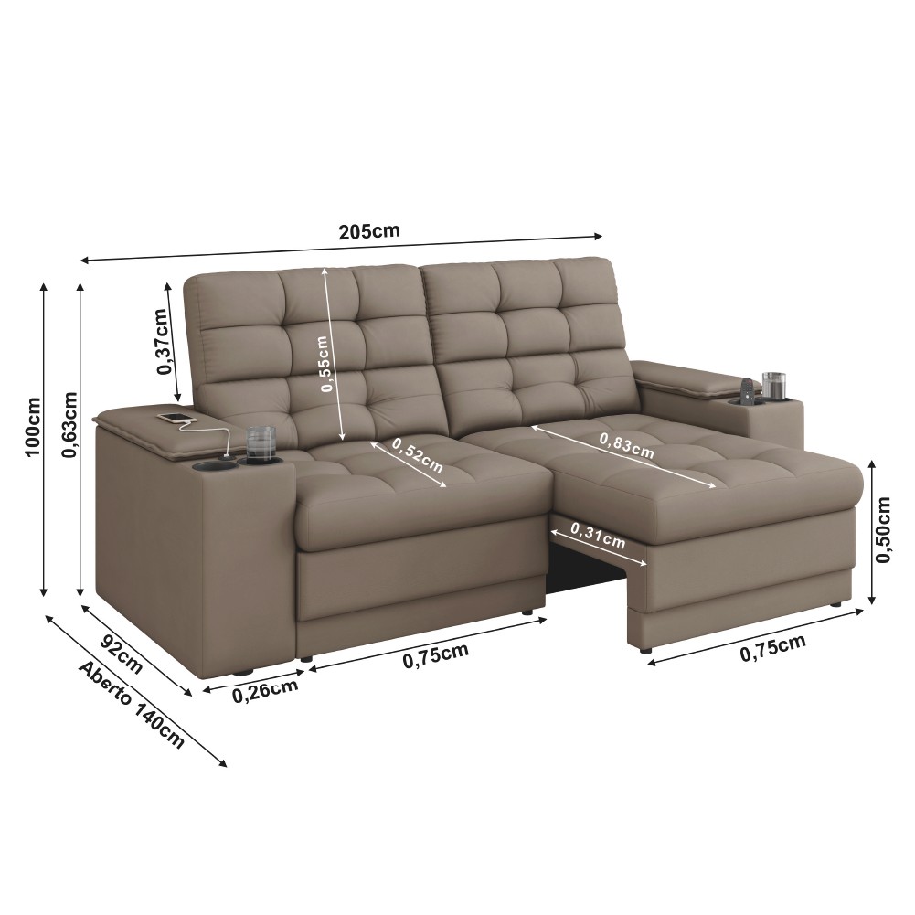 Sofá Retrátil e Reclinável 2,05m 3 Lugares Com Porta Copos Entrada USB Kansas Veludo Cappuccino Luizzi