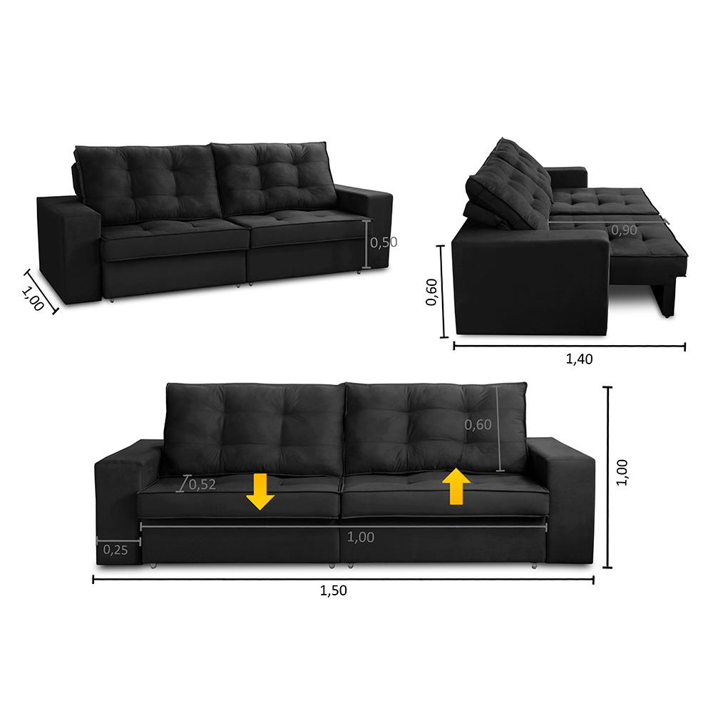 Sofá Retrátil e Reclinável 2 lugares 1,50m com Molas Marcela Suede Preto Adonai Estofados