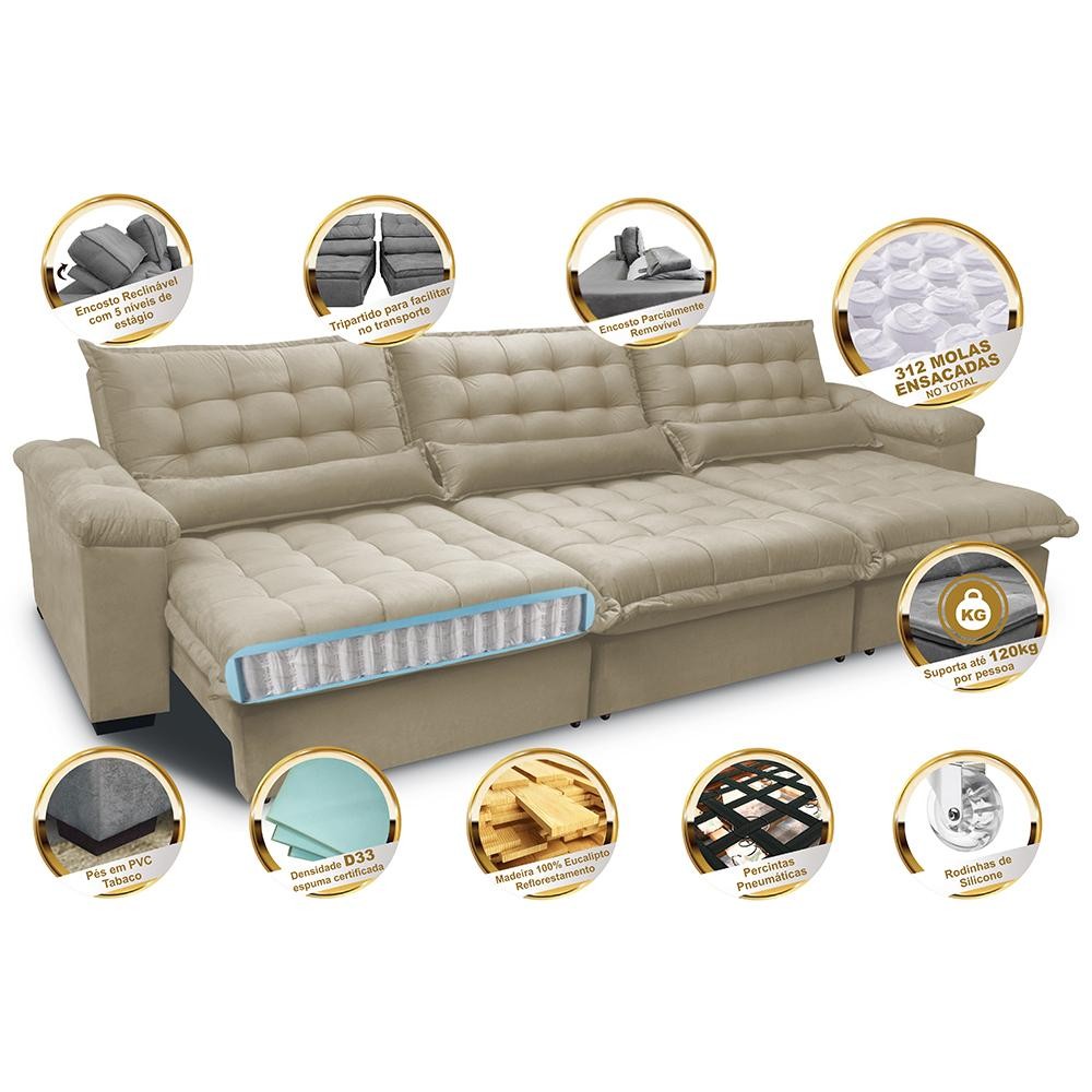 Sofá Retrátil e Reclinável 3,22m com Molas Ensacadas Cama inBox Aconchego Tecido Suede Bege