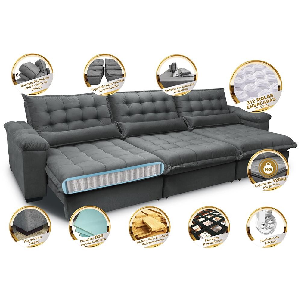 Sofá Retrátil e Reclinável 3,22m com Molas Ensacadas Cama inBox Aconchego Tecido Suede Cinza