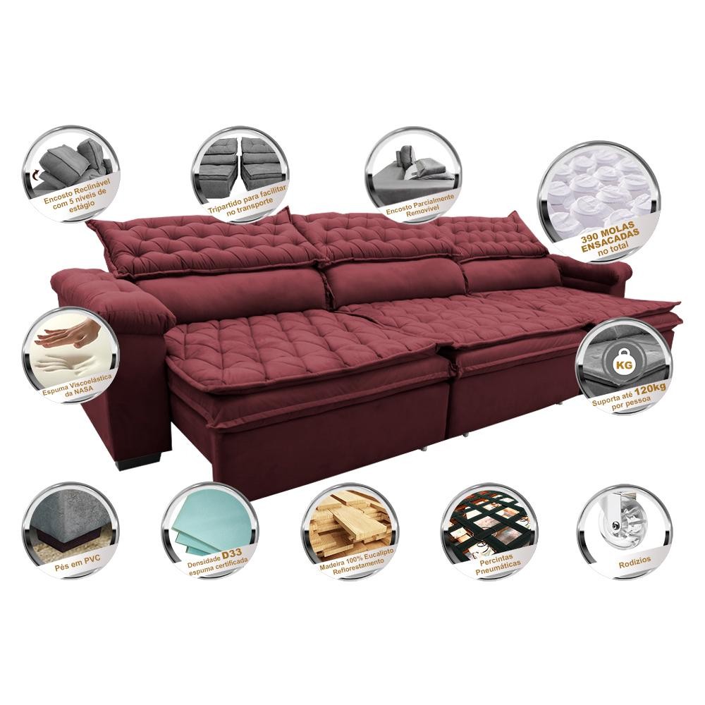 Sofá Retrátil e Reclinável 3,52m Molas Ensacadas Cama inBox Botonê Espuma Viscoelástico Vinho