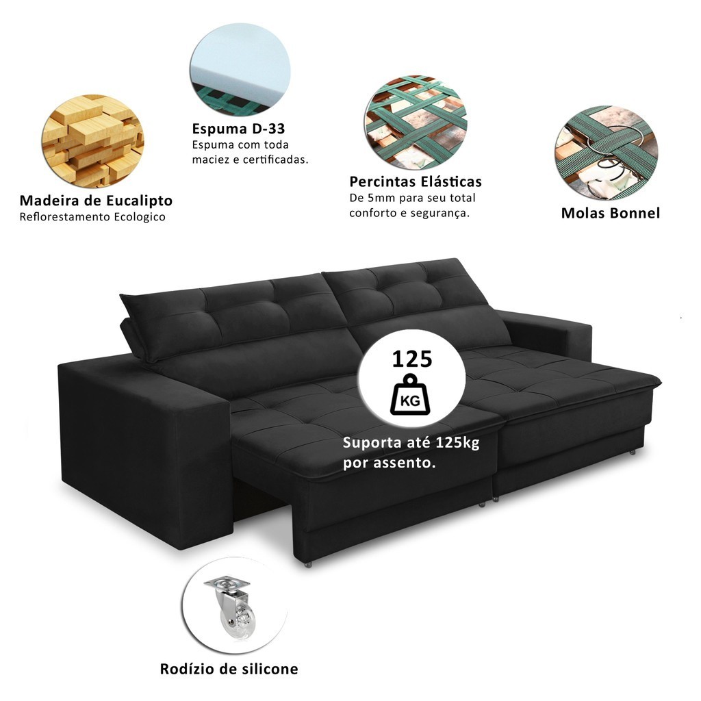 Sofá Retrátil e Reclinável 3 lugares 1,90m com Molas Emily Suede Adonai Estofados