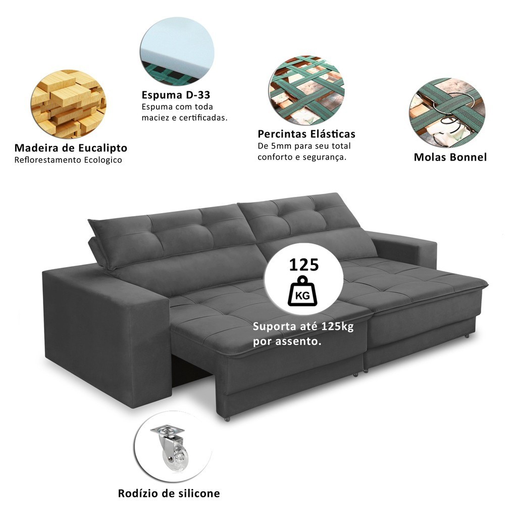 Sofá Retrátil e Reclinável 3 lugares 2,50m com Molas Emily Suede Cinza Adonai Estofados