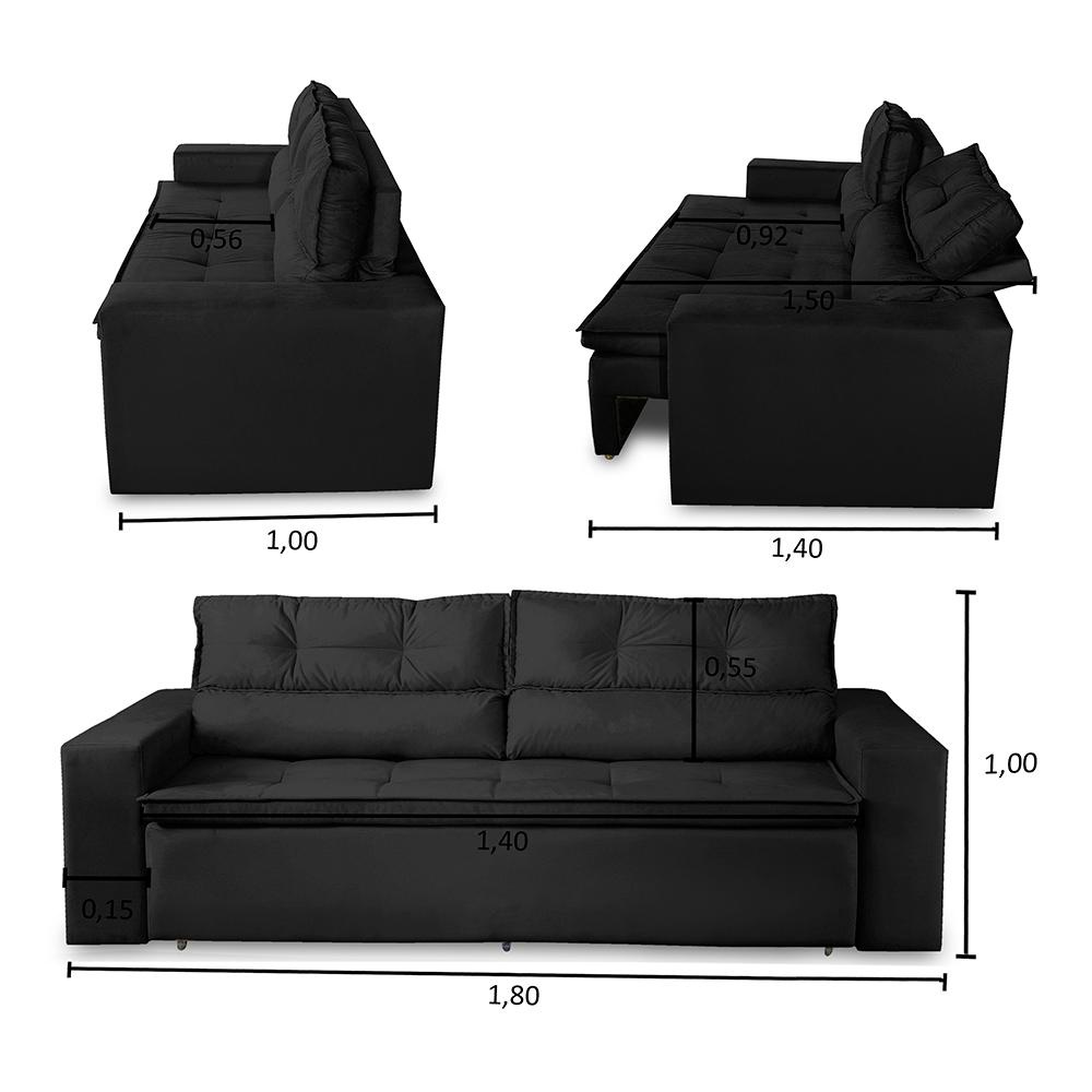 Sofá Retrátil e Reclinável 3 lugares com Molas 1,80m Vegas Suede Preto Adonai Estofados