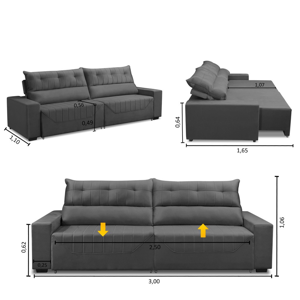 Transforme sua sala em um verdadeiro espaço de conforto e sofisticação com o Sofá Antonella da Adonai Estofados. Com design moderno e acabamento de alto padrão, ele acomoda até 5 pessoascom muito conforto em seus 3,00 metros de largura. Medidas do Produto Montado: - Largura: 3,00m - Altura: 1,06m - Profundidade total fechado: 1,10m - Profundidade total aberto: 1,65m - Largura de assento: 2,50m - Profundidade do assento fechado: 0,56cm - Profundidade do assento aberto: 1,07m - Altura do assento ao final do encosto: 0,62cm - Braço: 0,25cm - Chão ao assento: 0,49cm Especificações Técnicas: Encosto:Composto com enchimento de 80% fibra e 20% flocos que proporcionam maciez e conforto, além de possuir um kit de catracas com 3 estágios que te permite posicionar o encosto da maneira que mais lhe agrada. Assento:Composto pelo conjunto de espuma D-33, Molas Bonel e percintas elásticas de 5mm que são esticadas por uma percintadeira, que garante a melhor qualidade para o conforto e durabilidade do assento. Estrutura:Sua estrutura é toda composta por madeira de eucalipto 100% reflorestada, fixada por grampos galvanizados que vão fazer todo o trabalho de manter uma estrutura firme, com alta qualidade e durabilidade. Informações relevantes: - Esse produto suporta de 130 a 150kg por assento. *Este produto vai embalado em 2 Volumes. Garantia 90 dias após o recebimento do produto. Instruções de limpeza:Utilizar um pano limpo e seco.Não limpe com escovas ou produtos abrasivos. Observações importantes: - As imagens são meramente ilustrativas, não acompanham objetos de decoração e eletros; - As cores dos produtos podem sofrer alterações dependendo do seu monitor, tela de celular ou lote do tecido. - Todos os produtos vão embalados com total segurança; - Confira a embalagem e o produto no ato da entrega, caso o produto esteja em desacordo recuse imediatamente. - Não nos responsabilizamos no ato de entrega por montagens, desmontagens, instalações de produtos, nem uso de guinchos ou equipamentos para acesso a pisos superiores em apartamentos. - Confira as dimensões do produto no momento da compra e certifique-se de que passará por escadas, elevadores, portas e corredores. Observando as orientações acima, evita-se futuros desagrados ou imprevistos com a entrega do produto. CASO TENHA, A MONTAGEM DO PRODUTO É DE RESPONSABILIDADE DO COMPRADOR, NÃO EFETUAMOS A MONTAGEM DO PRODUTO. *As transportadorasNÃO SOBEMescadas, elevadores e não adentram residências* - A entrega será feita até a porta ou portaria do endereço no qual o pedido foi feito, qualquer necessidade de movimentação do produto até o local onde ele será utilizado é de inteira responsabilidade do CLIENTE, caso haja algum dano ou qualquer coisa do tipo no produto durante a movimentação NÃO NOS RESPONSABILIZAMOS.