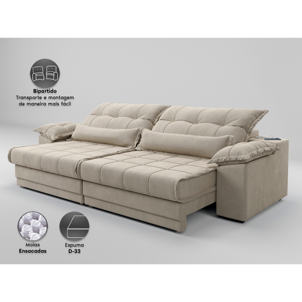 Sofá Retrátil e Reclinável com Molas ensacadas e Carregador USB Colosso 2,30m Veludocristal Areia - NETSOFAS