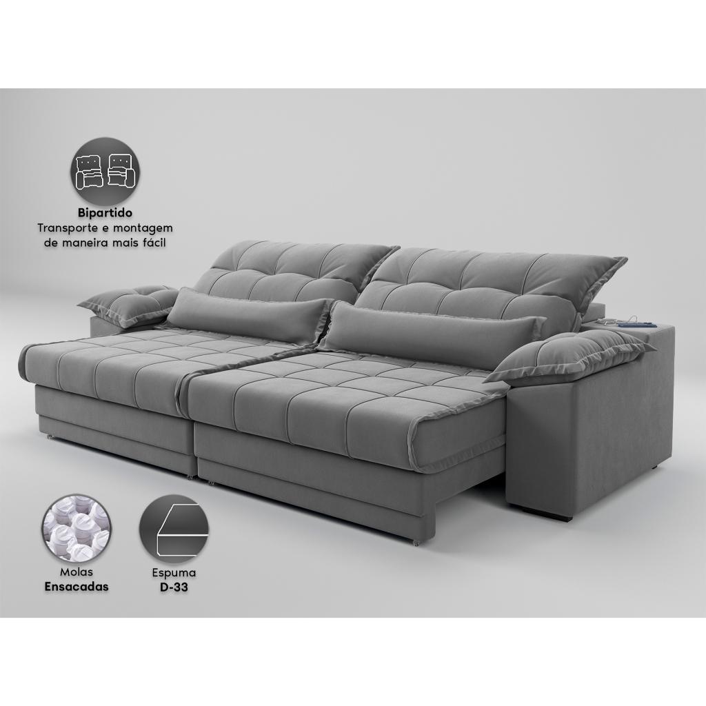 Sofá Retrátil e Reclinável com Molas ensacadas e Carregador USB Colosso 2,50m Veludocristal Cinza - NETSOFAS