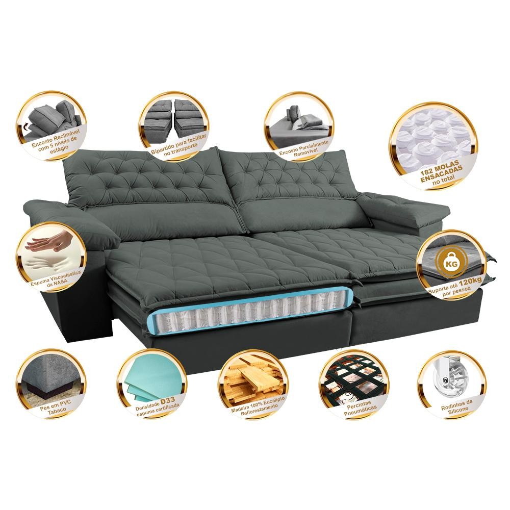 Sofá Retrátil e Reclinável Molas Ensacadas Cama inBox Botonê 2,12m Espuma Viscoelástico Suede Cinza