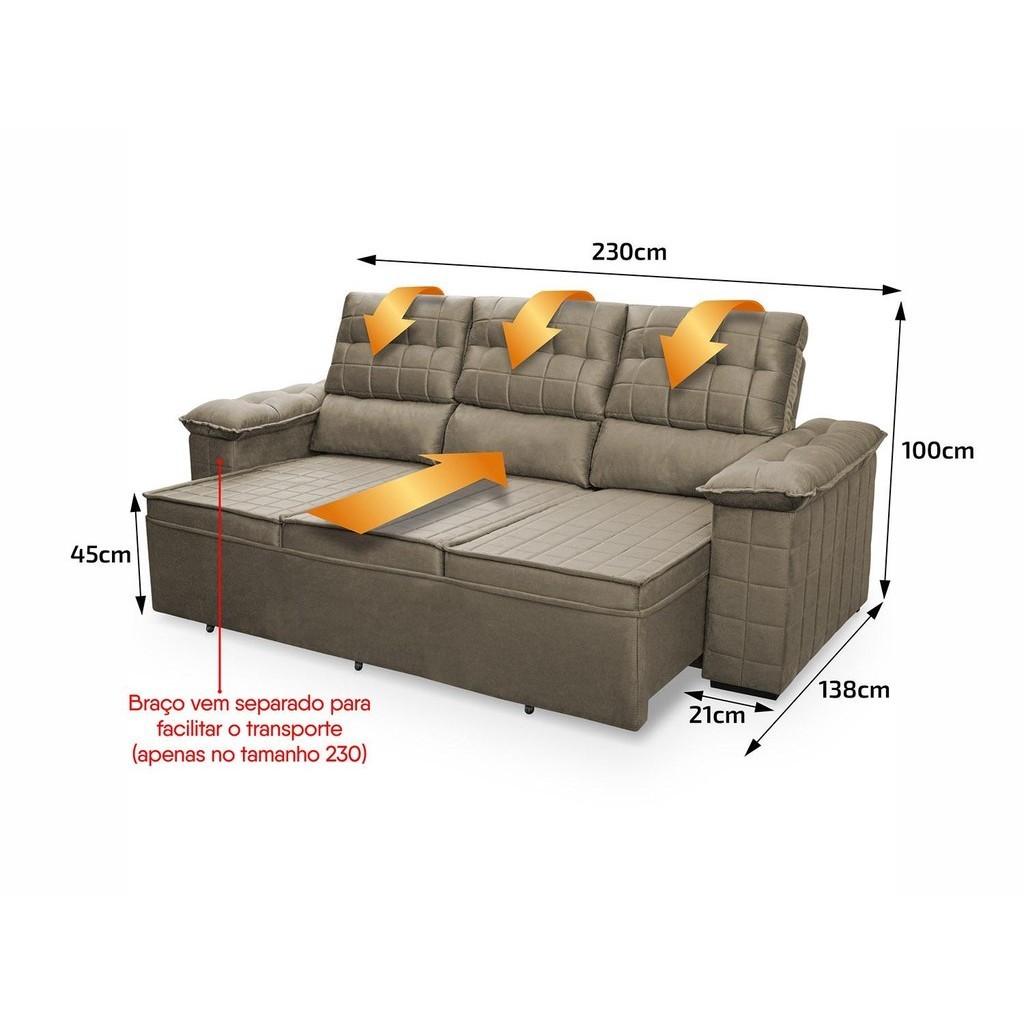 Dica Importante Gostou do produto, mas você tem preferência por outra cor ? Não tem problema, o Sofá Quantum está disponível 9 cores e 4 medidas diferentes para que se adapte a qualquer ambiente e agrade a todos os gostos :) Medida: 1,50m - 1,80m - 2,00m - 2,30m Materiais: Suede Velut Cores: Azul, Bege, Cinza, Cinza Lunar, Marrom, Marrom Café, Preto, Tabaco e Vermelho Caso você tenha interesse em visualizar os anúncios de alguma das opções acima, basta efetuar uma busca de acordo com as opções acima. Introdução ao Produto Sabe aquela sensação de felicidade e satisfação que você sente quando faz uma boa escolha ?! Pois bem, essa é a sensação de comprar um sofá Quantum. Um produto moderno, com design elegante que combina com qualquer ambiente e o deixa ainda mais lindo e aconchegante. Ele possui encosto reclinável em cinco posições, proporcionando-lhe mais conforto na hora do descanso. Não para por aí: seu assento retrátil conta com espuma D23, transformando seu sofá em uma verdadeira cama para assistir seu filme preferido. Não perca mais tempo e garanta já o seu sofá Quantum! Características - Capacidade: 3 ou mais pessoas - Peso real suportado: 120kg por pessoa - Encosto reclinável de 5 posições - Assento retrátil com espuma D23 - Encosto em Fibra Siliconada - Estrutura em madeira de reflorestamento, eucalipto Dimensões (Produto montado) - Altura: 1,00 m - Largura : 2,30 m - Profundidade: 0,98 m - Profundidade aberto: 1,35 m Montagem A montagem do produto pode ser feita facilmente seguindo o manual de instruções que acompanha a embalagem do produto. Não é necessário técnico especializado. Garantia: 90 dias Informações Relevantes - Não nos responsabilizamos pela instalação e montagem - Antes de efetuar a compra, verifique cuidadosamente as dimensões do produto, certificando-se de que o mesmo poderá ser transportado por portas, corredores e elevadores, evitando inconvenientes durante a entrega - Não nos responsabilizamos pelo transporte por escadas, elevadores, guincho ou içamento do produto. Todas as despesas associadas a esses serviços são de responsabilidade do cliente. - Não nos responsabilizamos por entregas em zonas rurais, fazendas, vias não pavimentadas ou sem endereço bem identificado e mapeado por equipamentos GPS, mesmo que a zona rural esteja inscrita em região metropolitana. As entregas nessas localidades estão sujeitas a cobranças adicionais para execução com operação dedicada, mediante prévia negociação com o cliente. Não há um valor fixo determinado, pois a dificuldade excessiva e custos podem variar caso a caso - As imagens são meramente ilustrativas, podendo ocorrer variações de tonalidades nos tecidos devido às variações nas configurações de monitores ou telas. - Os objetos decorativos nas imagens não acompanham o produto. - Não realizamos trocas por outros modelos ou medidas diferentes. Certifique-se de escolher o produto correto conforme suas necessidades - Prestamos assistência técnica exclusivamente para defeitos de fabricação.