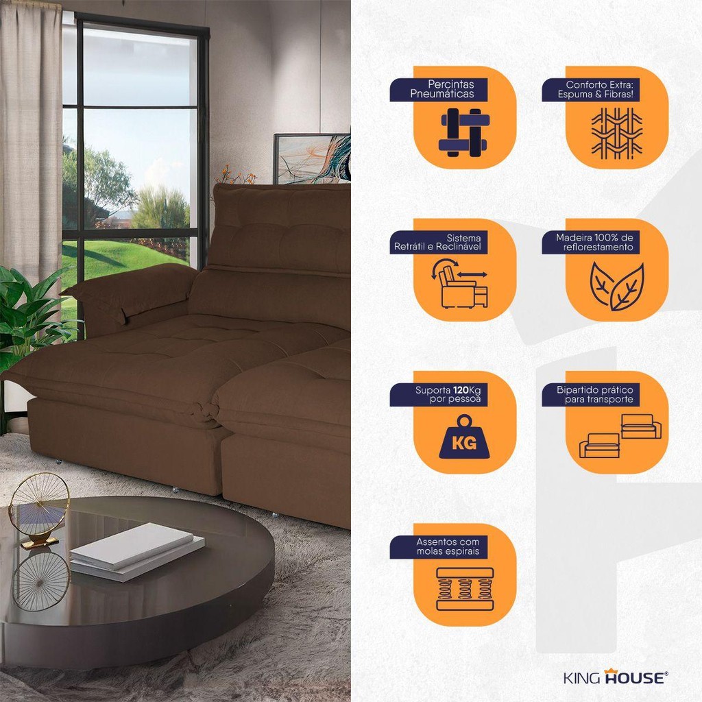 Dica Importante Gostou do produto, mas o tamanho não se encaixa em seu ambiente, ou então você tem preferência por outra cor ? Não tem problema, o sofá Aconchego está disponível em 5 medidas e 4 cores diferentes para que se adapte a qualquer ambiente e agrade a todos os gostos :) Medidas: 2,30m, 2,50m, 2,70m. Material: Linho Bouclê Cores: Bege, Cinza, Marrom Claro, Marrom Café Caso você tenha interesse em visualizar os anúncios de alguma das opções acima, basta efetuar uma busca de acordo com as opções descritas. Introdução ao Sofá Aconchego Imagine ter em sua casa um sofá que não só combina com seu ambiente, mas também transforma seus momentos de descanso em uma experiência única. O Sofá Aconchego é pensado para proporcionar conforto de verdade: seu encosto reclinável ajusta-se em cinco posições, permitindo relaxar como você merece, seja para ler um livro, bater papo ou simplesmente descansar. Mas o Aconchego oferece mais que conforto – seu assento retrátil, com uma combinação de espuma de alta qualidade, fibra siliconada e molas espirais, cria uma superfície acolhedora, perfeita para deitar e curtir o seu filme favorito. E seu design elegante eleva o ambiente, criando uma atmosfera de aconchego e sofisticação. Dê esse presente para sua casa e para você. Escolha o sofá Aconchego e descubra o verdadeiro significado de conforto e estilo. Características - Capacidade: 2,30m, (3 pessoas). - Quantidade de assentos reclináveis:( 2 assentos). - Quantidade de módulos: ( 2 módulos). - Peso real suportado: 120kg por pessoa - Encosto reclinável de 5 posições - Almofadas do encosto em fibra siliconada - Assento retrátil com suporte de molas espirais - Espuma de Alta Qualidade e Fibra Siliconada - Braço preenchido com fibra siliconada - Estrutura em madeira de reflorestamento, eucalipto e pinus Dimensões (Produto montado) - Altura: 1,20m - Profundidade: 1,20m - Profundidade aberto: 1,75m - Largura: 2,30m Montagem A montagem do produto pode ser feita facilmente seguindo o manual de instruções que acompanha a embalagem do produto. Não é necessário técnico especializado. Garantia: 90 dias Informações Relevantes - Não nos responsabilizamos pela instalação e montagem - Antes de efetuar a compra, verifique cuidadosamente as dimensões do produto, certificando-se de que o mesmo poderá ser transportado por portas, corredores e elevadores, evitando inconvenientes durante a entrega - Não nos responsabilizamos pelo transporte por escadas, elevadores, guincho ou içamento do produto. Todas as despesas associadas a esses serviços são de responsabilidade do cliente. - Não nos responsabilizamos por entregas em zonas rurais, fazendas, vias não pavimentadas ou sem endereço bem identificado e mapeado por equipamentos GPS, mesmo que a zona rural esteja inscrita em região metropolitana. As entregas nessas localidades estão sujeitas a cobranças adicionais para execução com operação dedicada, mediante prévia negociação com o cliente. Não há um valor fixo determinado, pois a dificuldade excessiva e custos podem variar caso a caso - As imagens são meramente ilustrativas, podendo ocorrer variações de tonalidades nos tecidos devido às variações nas configurações de monitores ou telas. - Os objetos decorativos nas imagens não acompanham o produto. - Não realizamos trocas por outros modelos ou medidas diferentes. Certifique-se de escolher o produto correto conforme suas necessidades - Prestamos assistência técnica exclusivamente para defeitos de fabricação.