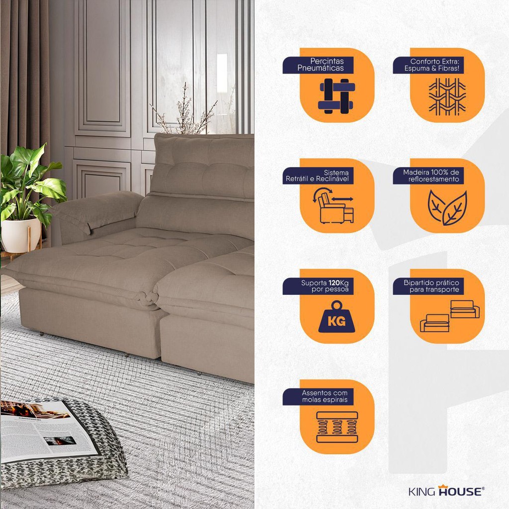 Dica Importante Gostou do produto, mas o tamanho não se encaixa em seu ambiente, ou então você tem preferência por outra cor ? Não tem problema, o sofá Aconchego está disponível em 5 medidas e 4 cores diferentes para que se adapte a qualquer ambiente e agrade a todos os gostos :) Medidas: 2,30m, 2,50m, 2,70m. Material: Linho Bouclê Cores: Bege, Cinza, Marrom Claro, Marrom Café Caso você tenha interesse em visualizar os anúncios de alguma das opções acima, basta efetuar uma busca de acordo com as opções descritas. Introdução ao Sofá Aconchego Imagine ter em sua casa um sofá que não só combina com seu ambiente, mas também transforma seus momentos de descanso em uma experiência única. O Sofá Aconchego é pensado para proporcionar conforto de verdade: seu encosto reclinável ajusta-se em cinco posições, permitindo relaxar como você merece, seja para ler um livro, bater papo ou simplesmente descansar. Mas o Aconchego oferece mais que conforto – seu assento retrátil, com uma combinação de espuma de alta qualidade, fibra siliconada e molas espirais, cria uma superfície acolhedora, perfeita para deitar e curtir o seu filme favorito. E seu design elegante eleva o ambiente, criando uma atmosfera de aconchego e sofisticação. Dê esse presente para sua casa e para você. Escolha o sofá Aconchego e descubra o verdadeiro significado de conforto e estilo. Características - Capacidade: 2,30m, (3 pessoas). - Quantidade de assentos reclináveis:( 2 assentos). - Quantidade de módulos: ( 2 módulos). - Peso real suportado: 120kg por pessoa - Encosto reclinável de 5 posições - Almofadas do encosto em fibra siliconada - Assento retrátil com suporte de molas espirais - Espuma de Alta Qualidade e Fibra Siliconada - Braço preenchido com fibra siliconada - Estrutura em madeira de reflorestamento, eucalipto e pinus Dimensões (Produto montado) - Altura: 1,20m - Profundidade: 1,20m - Profundidade aberto: 1,75m - Largura: 2,30m Montagem A montagem do produto pode ser feita facilmente seguindo o manual de instruções que acompanha a embalagem do produto. Não é necessário técnico especializado. Garantia: 90 dias Informações Relevantes - Não nos responsabilizamos pela instalação e montagem - Antes de efetuar a compra, verifique cuidadosamente as dimensões do produto, certificando-se de que o mesmo poderá ser transportado por portas, corredores e elevadores, evitando inconvenientes durante a entrega - Não nos responsabilizamos pelo transporte por escadas, elevadores, guincho ou içamento do produto. Todas as despesas associadas a esses serviços são de responsabilidade do cliente. - Não nos responsabilizamos por entregas em zonas rurais, fazendas, vias não pavimentadas ou sem endereço bem identificado e mapeado por equipamentos GPS, mesmo que a zona rural esteja inscrita em região metropolitana. As entregas nessas localidades estão sujeitas a cobranças adicionais para execução com operação dedicada, mediante prévia negociação com o cliente. Não há um valor fixo determinado, pois a dificuldade excessiva e custos podem variar caso a caso - As imagens são meramente ilustrativas, podendo ocorrer variações de tonalidades nos tecidos devido às variações nas configurações de monitores ou telas. - Os objetos decorativos nas imagens não acompanham o produto. - Não realizamos trocas por outros modelos ou medidas diferentes. Certifique-se de escolher o produto correto conforme suas necessidades - Prestamos assistência técnica exclusivamente para defeitos de fabricação.