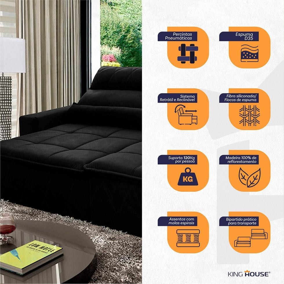 Sofá Retrátil Reclinável Amsterdam 2,50m Suede Velut Preto Molas no Assento - King House
